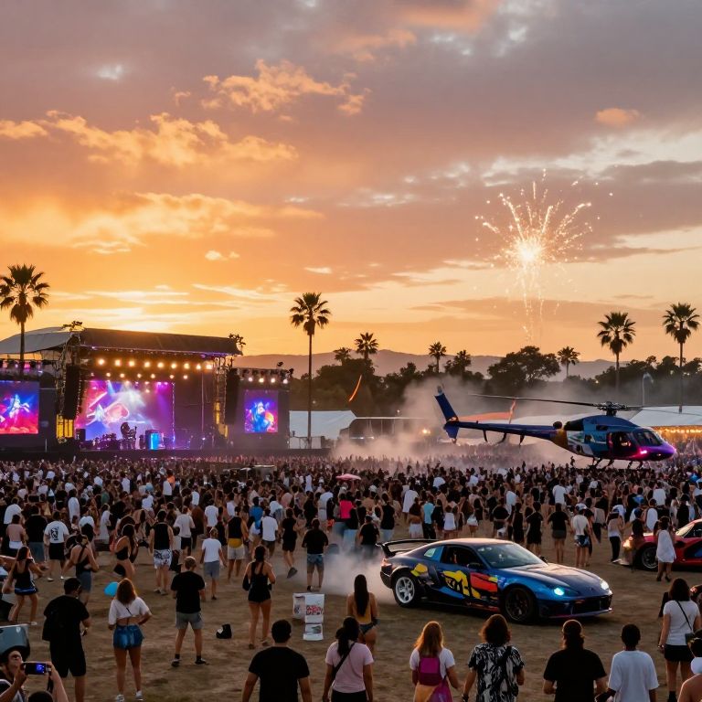A vibrant music festival with thousands of people dancing under a sunset sky, featuring palm trees, a helicopter, drift cars, and fireworks.