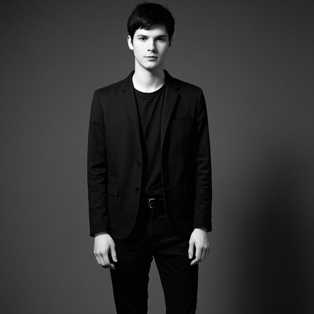 Black and white image of a young man with short dark hair and pale skin wearing a fitted black blazer, white shirt, black tie, and slim black trousers. The subject poses against a plain monochrome background, reflecting a simple 1980s fashion style inspired by Joy Division aesthetics.