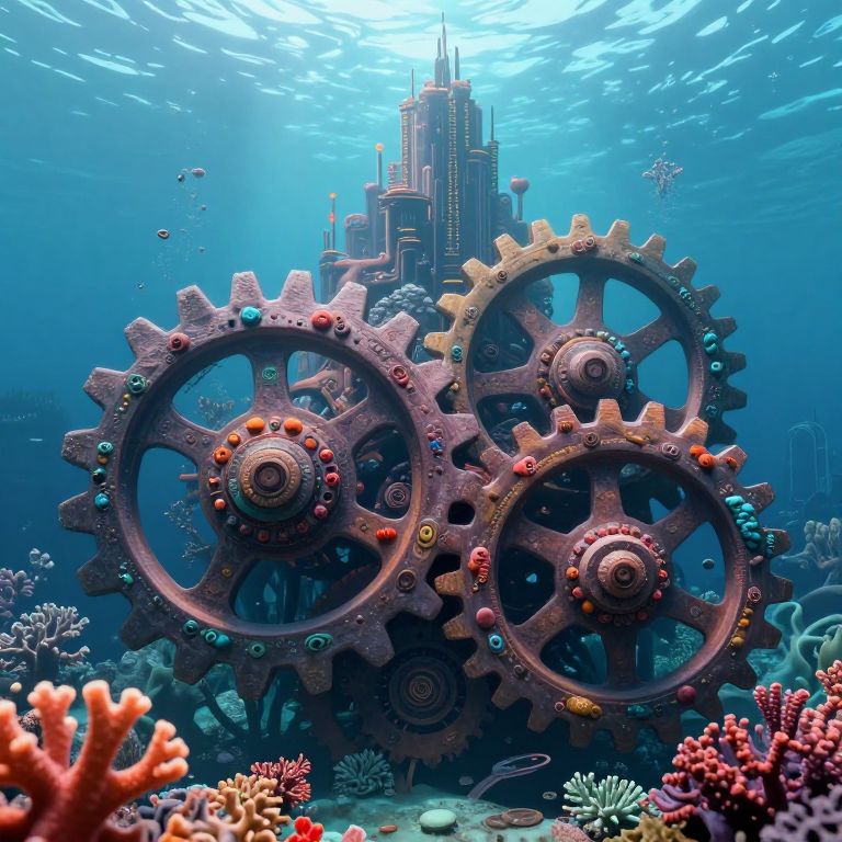 A surreal 3D-rendered scene depicts massive gears crafted from living coral, intricately interlocking beneath the ocean's surface, evoking a cyberpunk-inspired vision of mythical underwater metropolises that emerge and vanish cyclically.