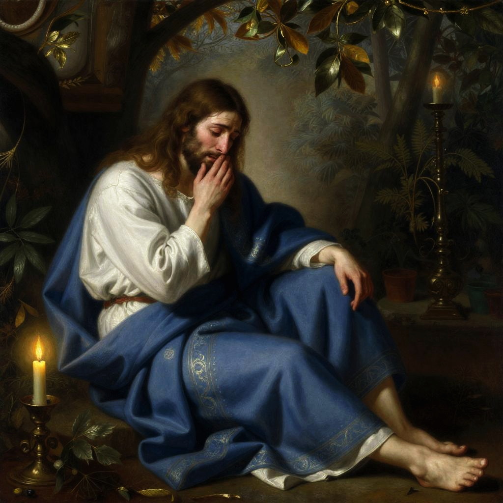 Jesus in the garden of Gethsemane, depicted as apostle John in a deeply sorrowful moment. Rendered in romanticism style with art by Eugène Delacroix. Focus on long flowing hair, sobbing face, intricate blue cloak and warm candlelit glow.