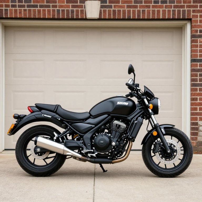 2019 Kawasaki Vulcan S ABS motorcycle parked in front of a beige garage door and brick wall in Marietta, Ohio, showcasing its sleek black finish, dual exhaust pipes, and classic cruiser design.