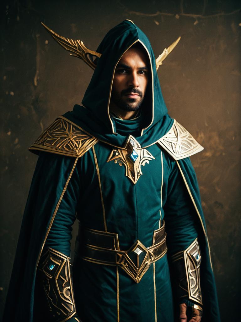 Portrait of a man wearing an elaborate Nerevarine cosplay costume featuring a teal hooded cloak and golden armor with intricate designs. The realistic and detailed outfit includes a belt with an orange gem centerpiece, leather arm guards, and shoulder plates, embodying the fantasy character from the Elder Scrolls lore.