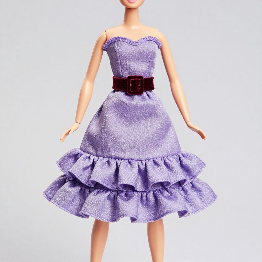 Barbie doll, full-length figure, wearing a lavender micro miniskirt with dramatic ruffles and a wide burgundy belt with burgundy velvet buckle