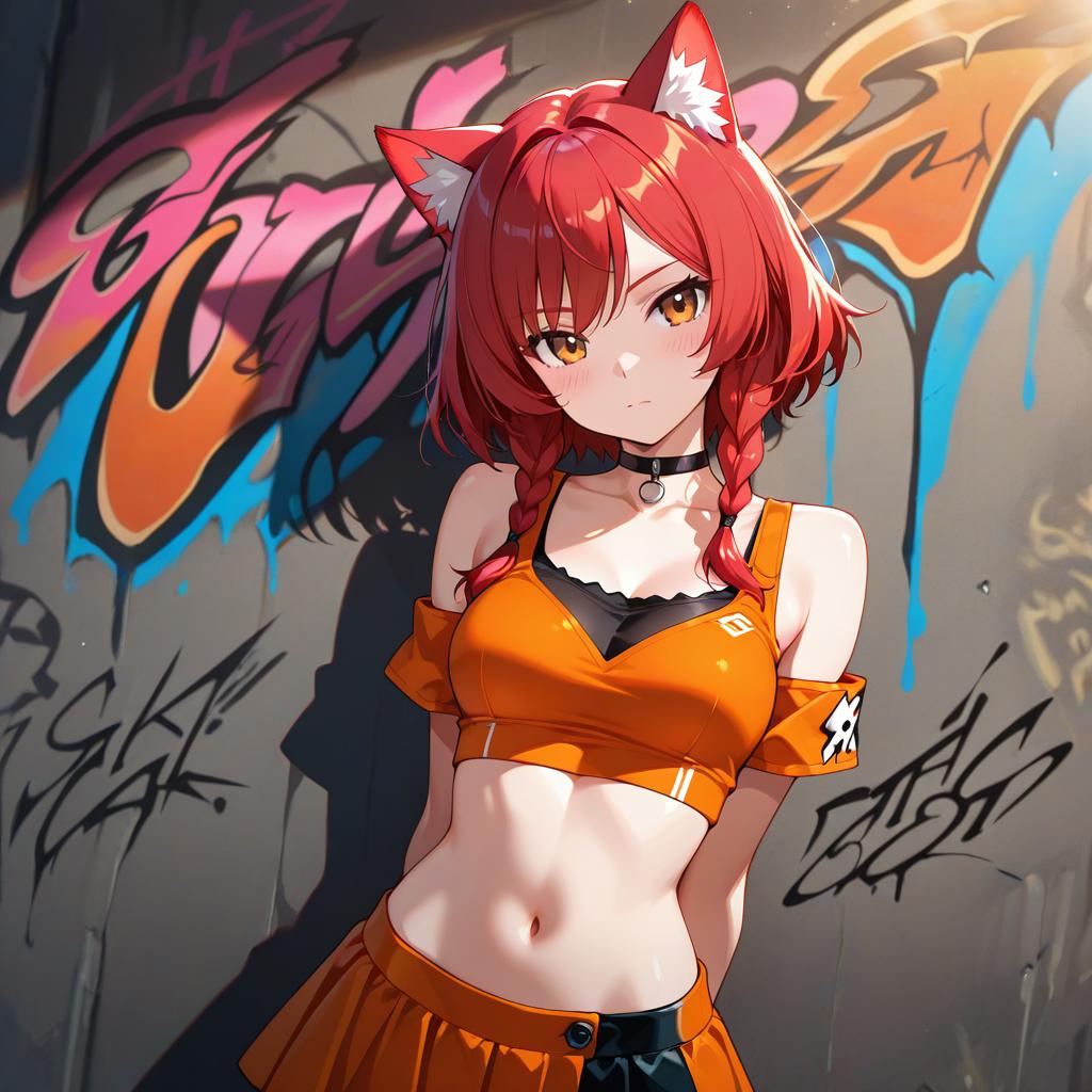 Masterpiece, best quality, 1girl, solo, stylish crop top, vibrant red hair, (fluffy cat ears), elegant braid, soft bangs, alluring choker, (graffiti:1.5), artistic paint splatter, seductive arms behind back, leaning against wall, looking at viewer, fashionable armband, urban hiphop style, flirty skirt, playful head tilt, intense expression, warm orange, dynamic asymmetrical design, bold geometric shapes, creative street art, sunlight and shadow