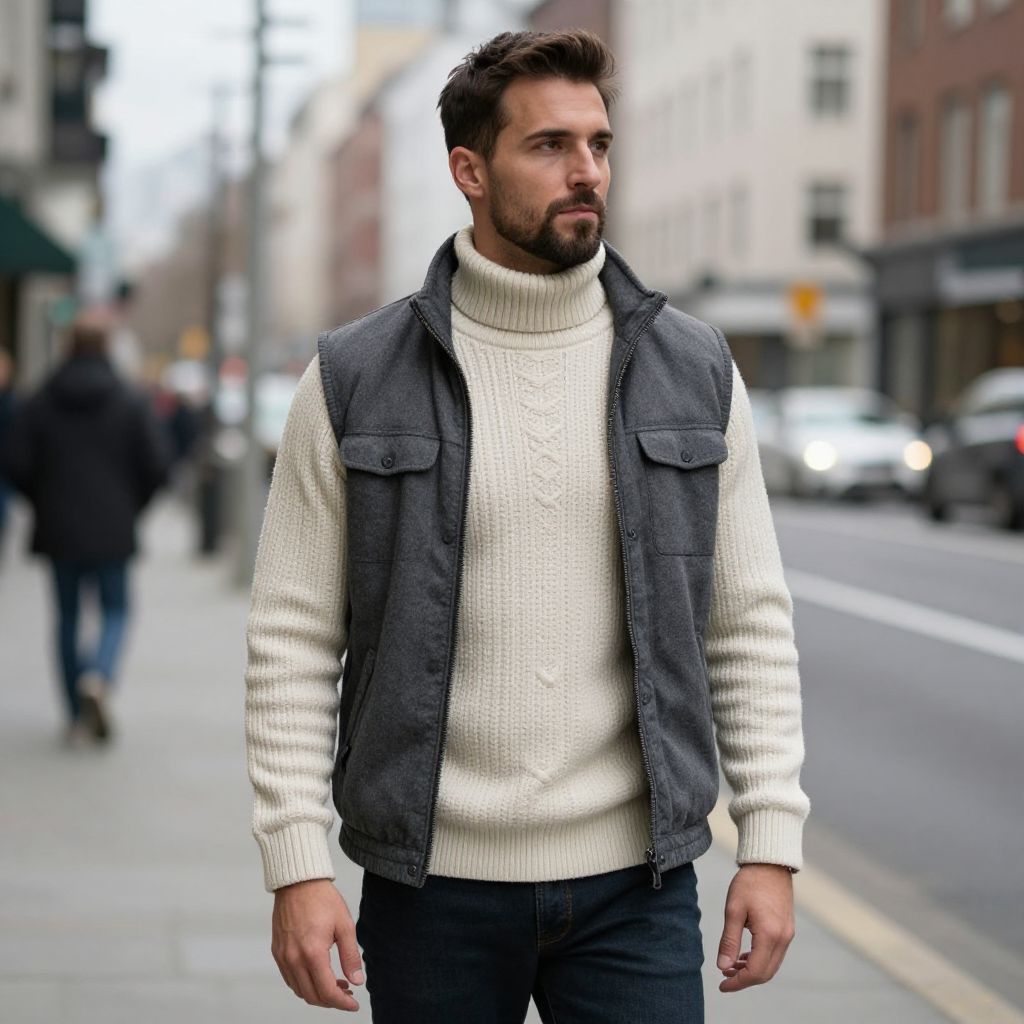 Photograph of a Caucasian man with a short, dark brown beard and styled hair, standing on an urban sidewalk. He wears a white, ribbed-knit turtleneck sweater under a gray, sleeveless denim vest, and dark blue jeans. The background shows a blurred city street with people walking, parked and moving cars, and buildings with large windows and brick facades. The man's expression is serious, and he looks slightly to his left. The image has a shallow depth of field, making the man the focal point while the background is softly out of focus.