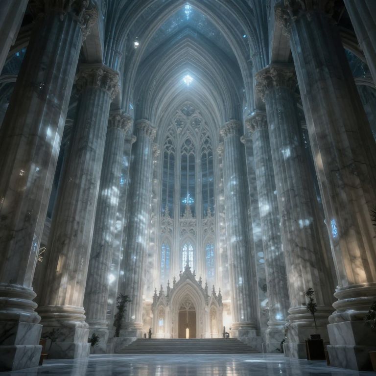 An ethereal cathedral of whispering marble emerges from the depths, its luminous stones pulsating with the echoes of ancient dreams, inviting contemplation amidst the haunting serenity of forgotten worlds.
