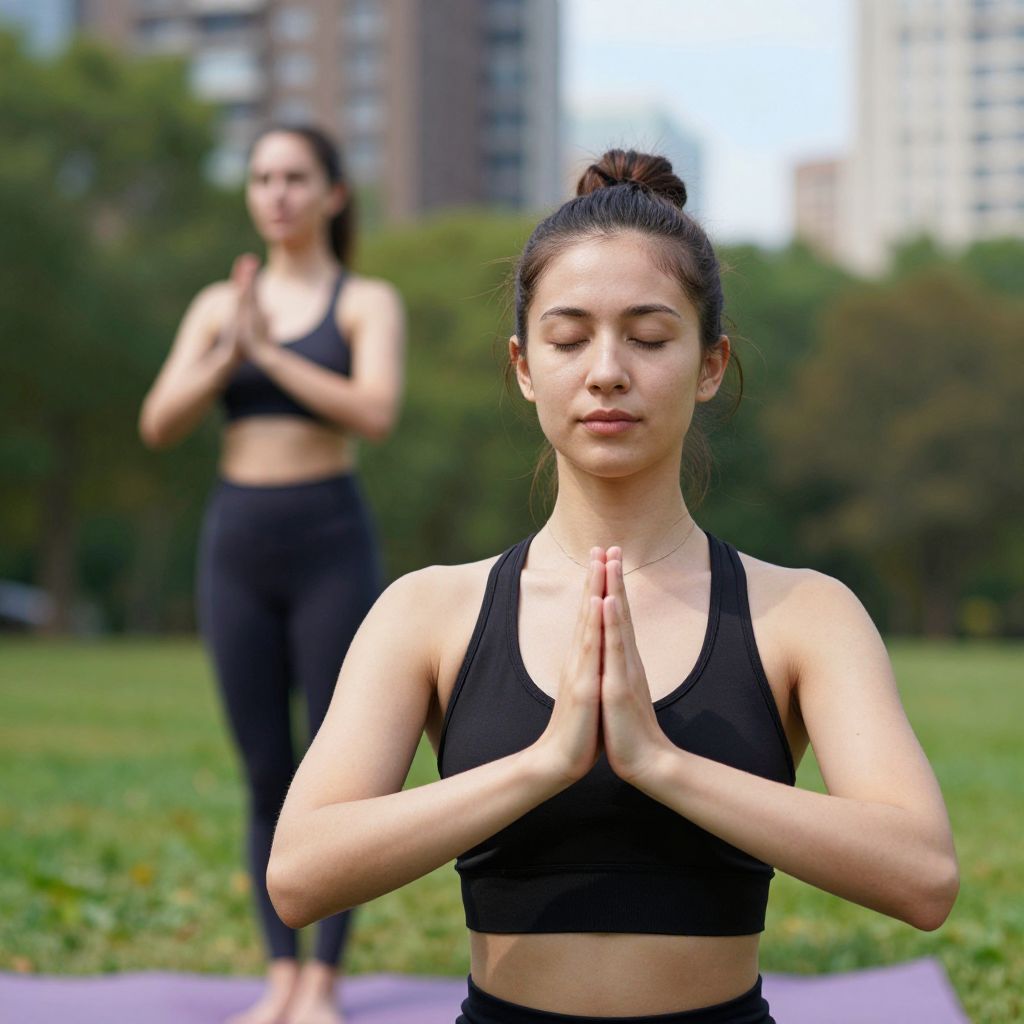 Two young women practicing yoga outdoors in a vibrant city park on a sunny day, with one woman in the foreground wearing a black sports bra and performing a prayer pose while another stands blurred in the background.