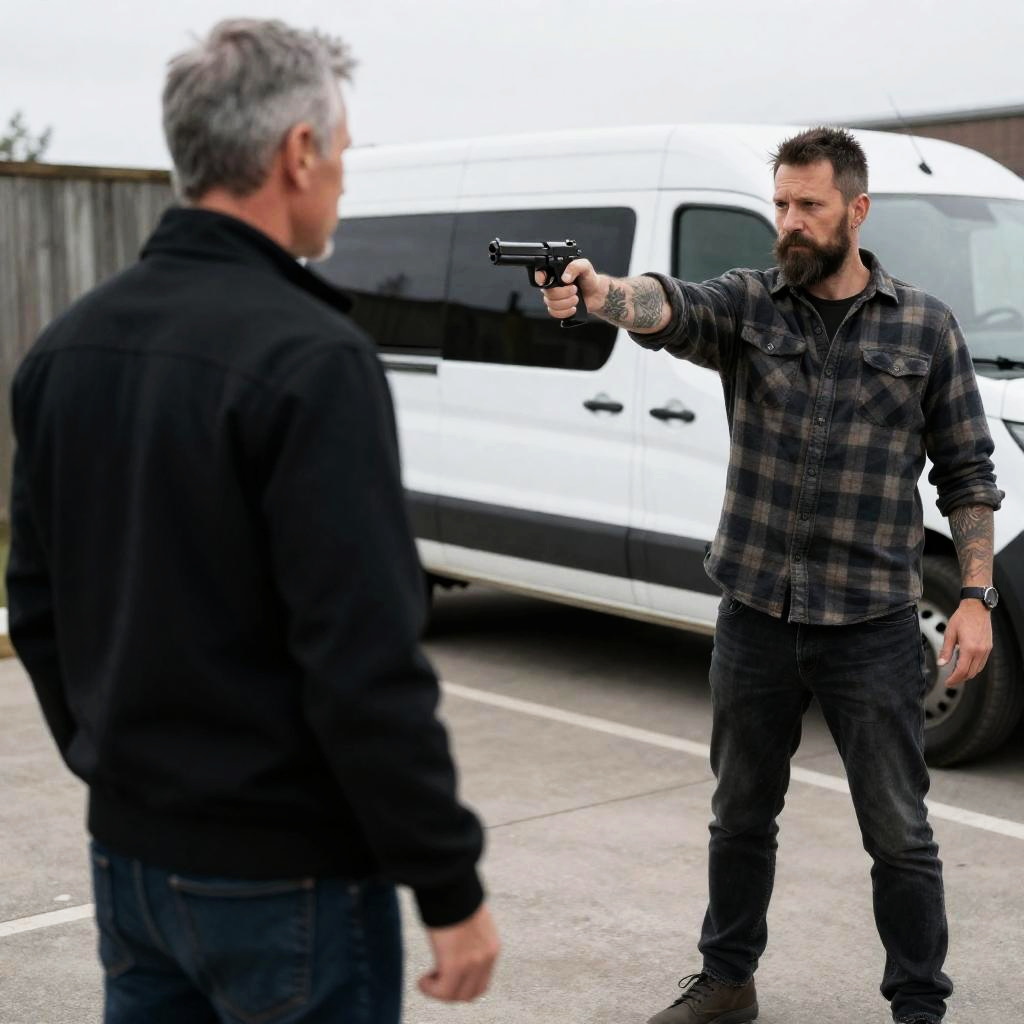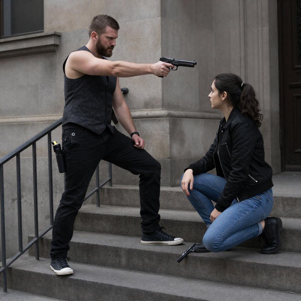 Photograph of two men in an outdoor setting. A white man with a beard, black t-shirt, and blue jeans points a gun at a black man with short hair, wearing a dark leather jacket. The black man's back is to the camera, hands raised. Concrete steps and trees in the background. The white man's expression is intense.
