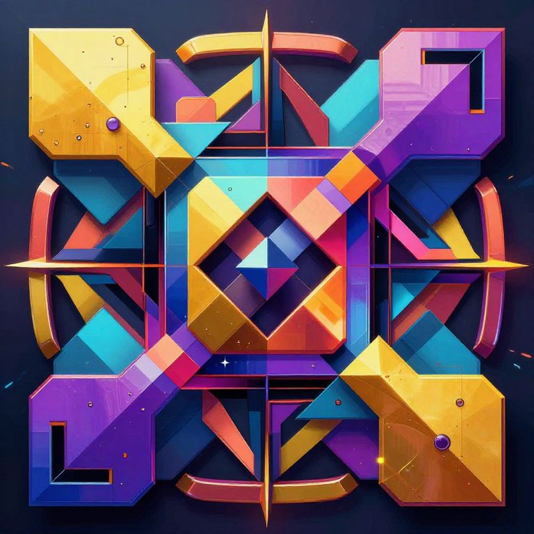 This is a digital, abstract, geometric artwork featuring a complex, colorful design. The image is dominated by large, intersecting, 3D shapes in bright yellow, blue, red, and purple. These shapes form a symmetrical pattern with sharp angles and edges, creating a sense of depth and dimension. The background is a dark gradient, enhancing the vibrant colors of the shapes. The design includes metallic textures with small, dotted details, giving it a slightly industrial feel. The overall composition is visually striking, with a modern, futuristic aesthetic. The image is centered and balanced, with the shapes overlapping to form a dynamic, visually engaging pattern.