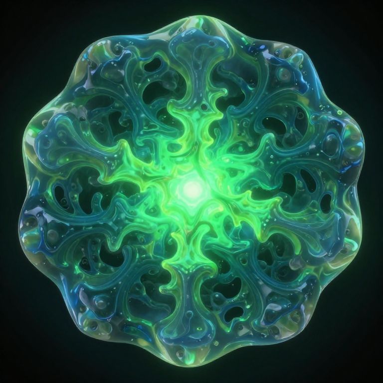 The image depicts a 3D top-down token of primordial ooze, characterized by a complex, organic structure with a central, glowing green core surrounded by a series of intricate, branching patterns. The token is encased in a translucent, gelatinous substance that flows and curves around the central design, creating a sense of depth and fluidity. The outer layer of the token is a deep blue-green, with lighter green accents that highlight the edges and contours of the structure. The central core emits a bright green glow, contrasting sharply with the darker hues of the surrounding patterns. The overall composition is symmetrical, with the branching patterns radiating outward in a balanced, radial arrangement. The token appears to be floating against a dark background, emphasizing its intricate details and the interplay of light and shadow.