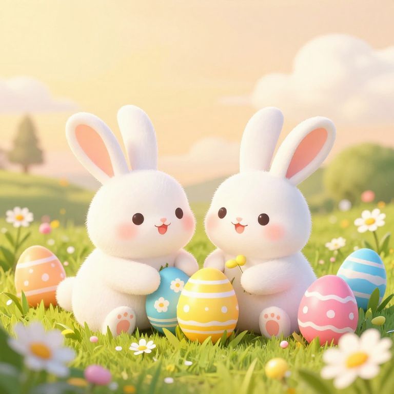 A whimsical digital illustration featuring two adorable bunnies nestled among colorful Easter eggs and daisies, set against a serene golden-hour backdrop with soft clouds and vibrant greenery, evoking a cheerful and nostalgic springtime atmosphere.