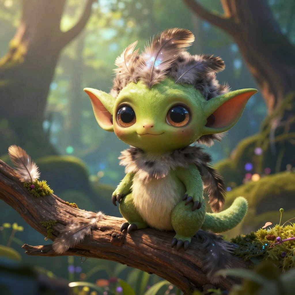 Cute kenku perched on a twisted wooden branch in an enchanted forest, soft feathers shimmering in morning light, big curious eyes, whimsical fantasy style with vibrant colors and intricate details, magical and friendly atmosphere.