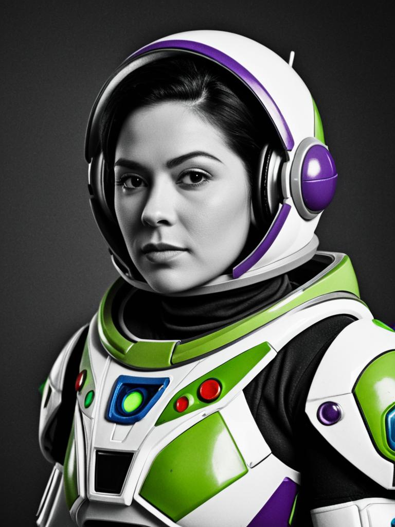 Woman in Buzz Lightyear Costume, photorealistic studio portrait, sharp detail