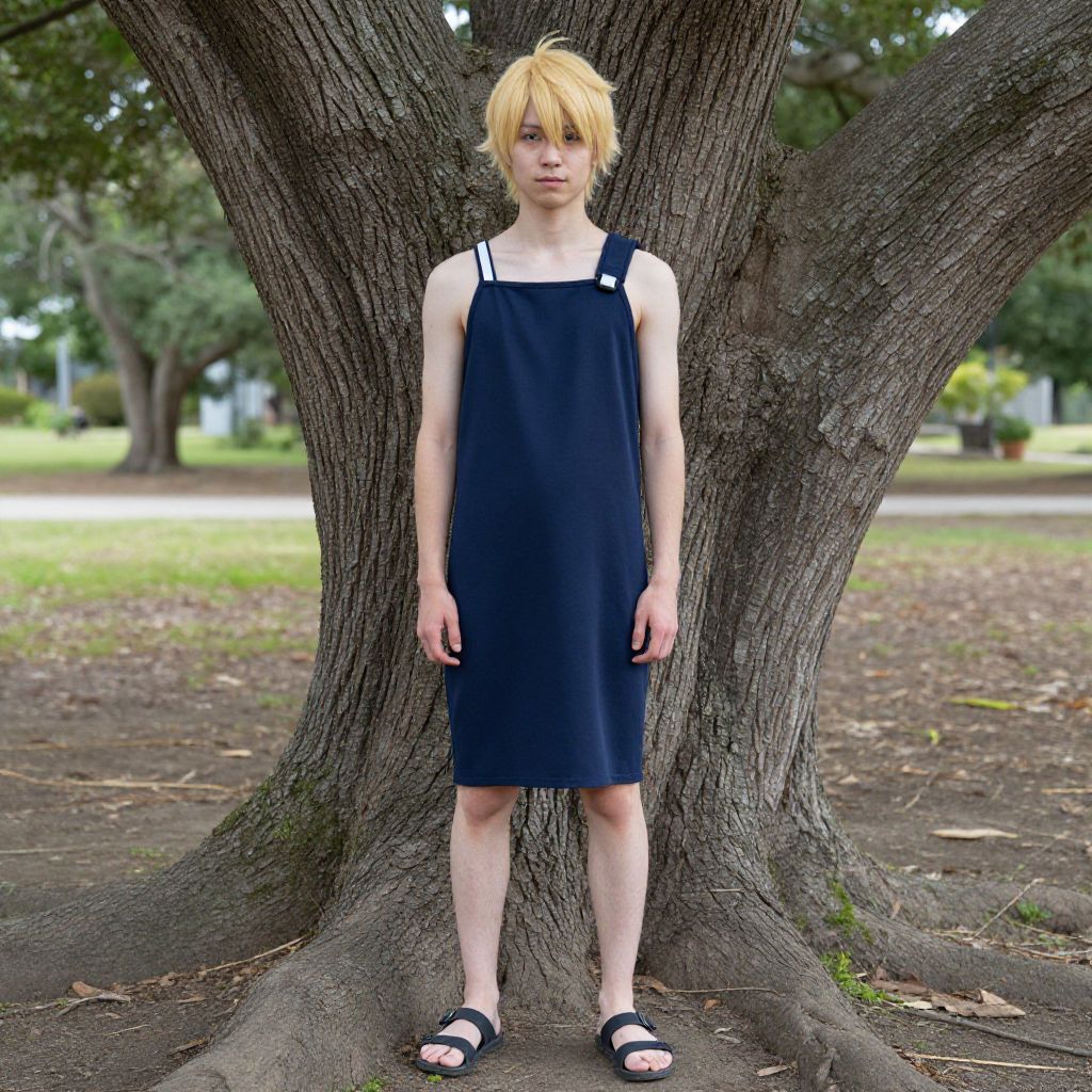 A photograph of a slender, pale-skinned young person with messy, blonde hair standing in front of a large tree in a park. They wear a simple, sleeveless black dress with thin straps, and black sandals. The background shows a grassy area with blurred trees and a pathway. The person's expression is neutral, and their arms hang loosely by their sides. The tree trunk's textured bark is prominent behind them, with sunlight filtering through the leaves.
