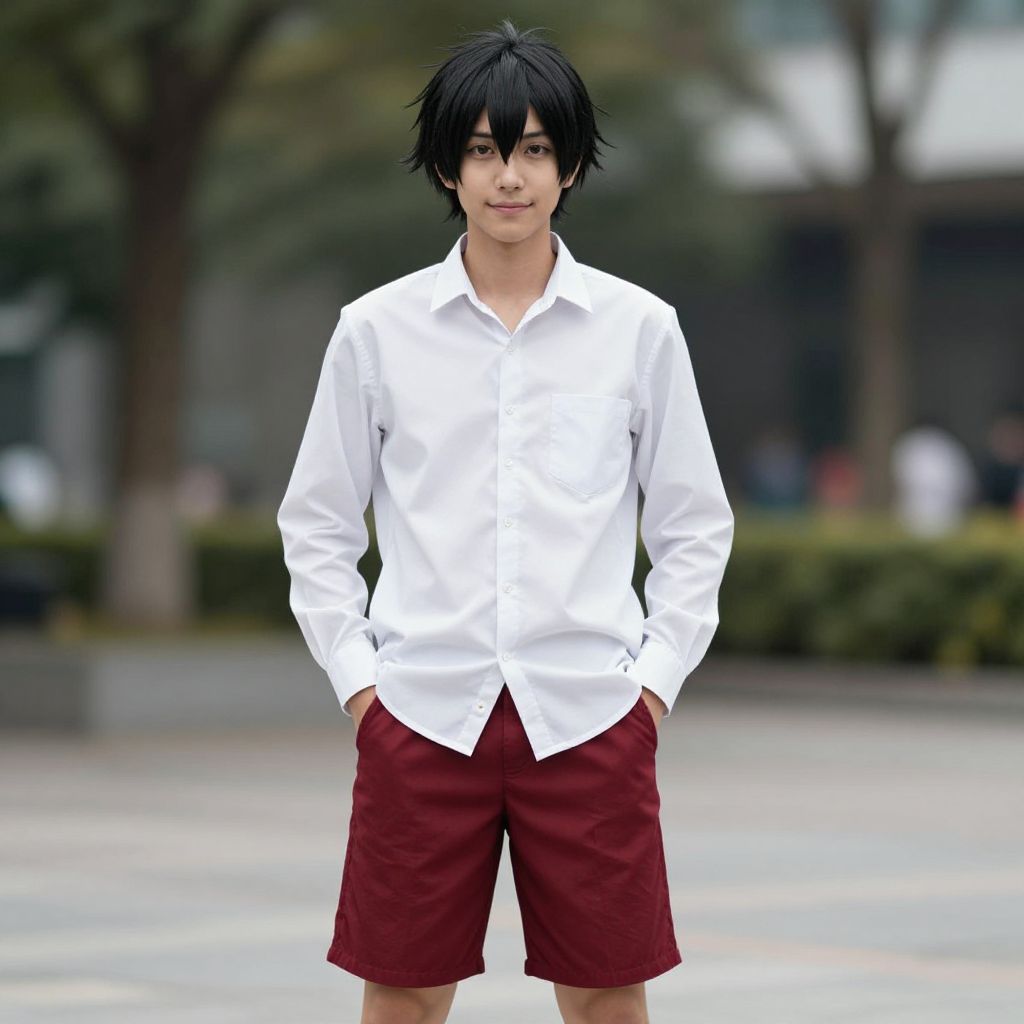"hero academia costume toga, solo, 1boy, male focus, outdoors, tree, realistic, standing, blonde hair, looking at viewer, sandals, full body, japanese clothes Realistic photo of casual sexy person with pretty face"