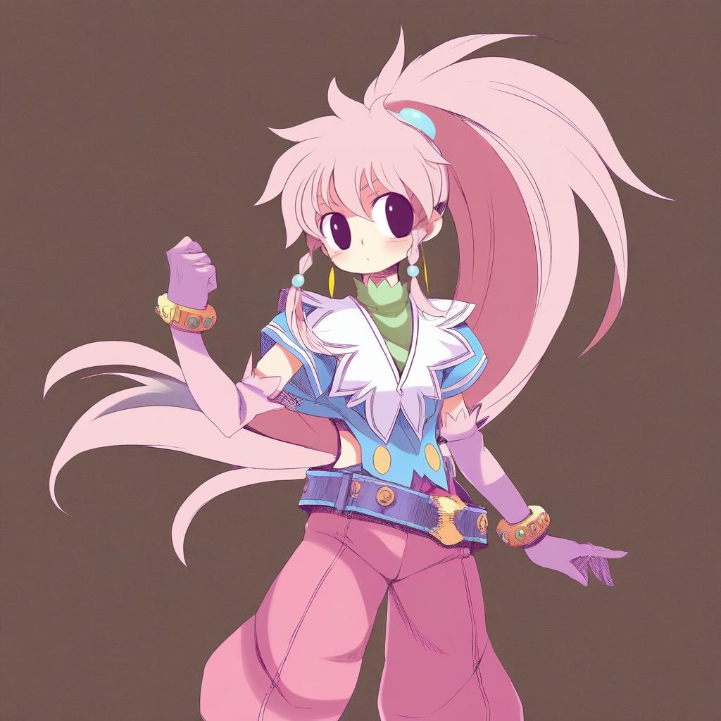 Arche klein, tales of (series), 1girl, pink eyes, pink hair, long hair, ponytail, wide ponytail, elbow gloves, pink pants, belt, earrings, bracelet, by artist takahero, leet