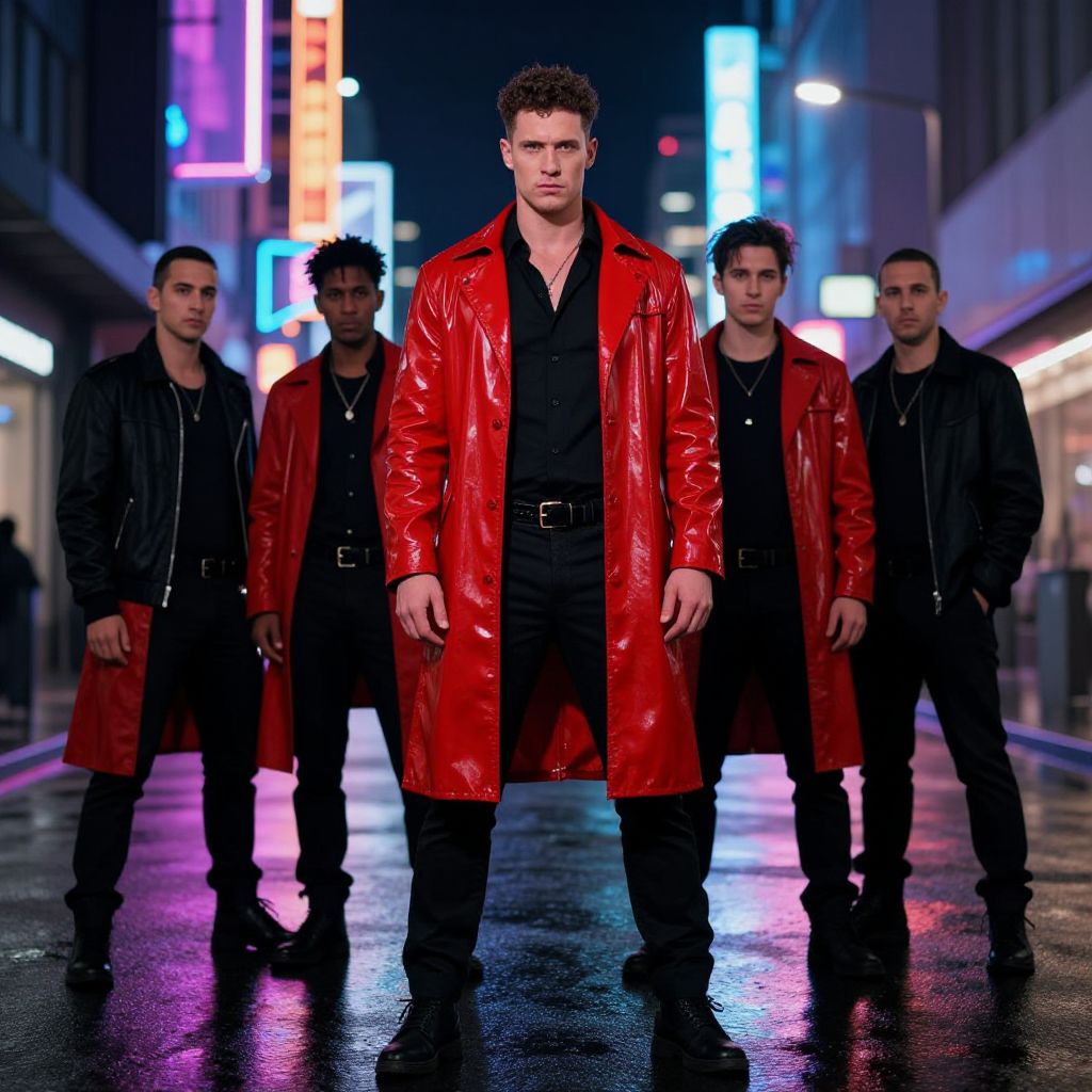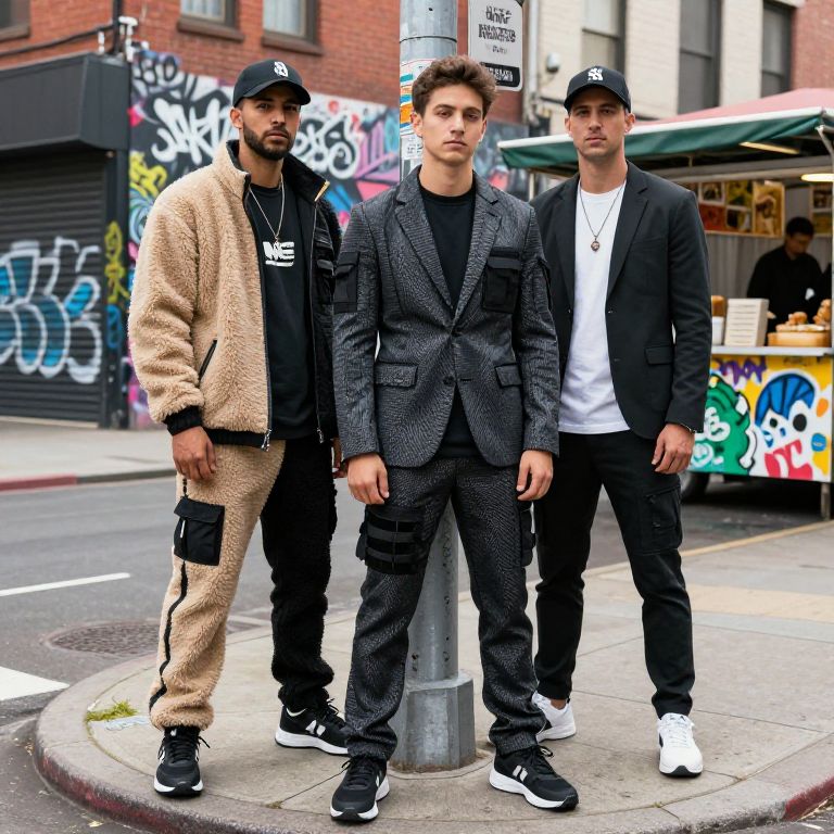 Streetwear influenced suits in a dynamic clash of textures—fleece, mesh, and tactical fabric—woven with city street symbols, placed on a street corner with graffiti walls and street food vendors.
