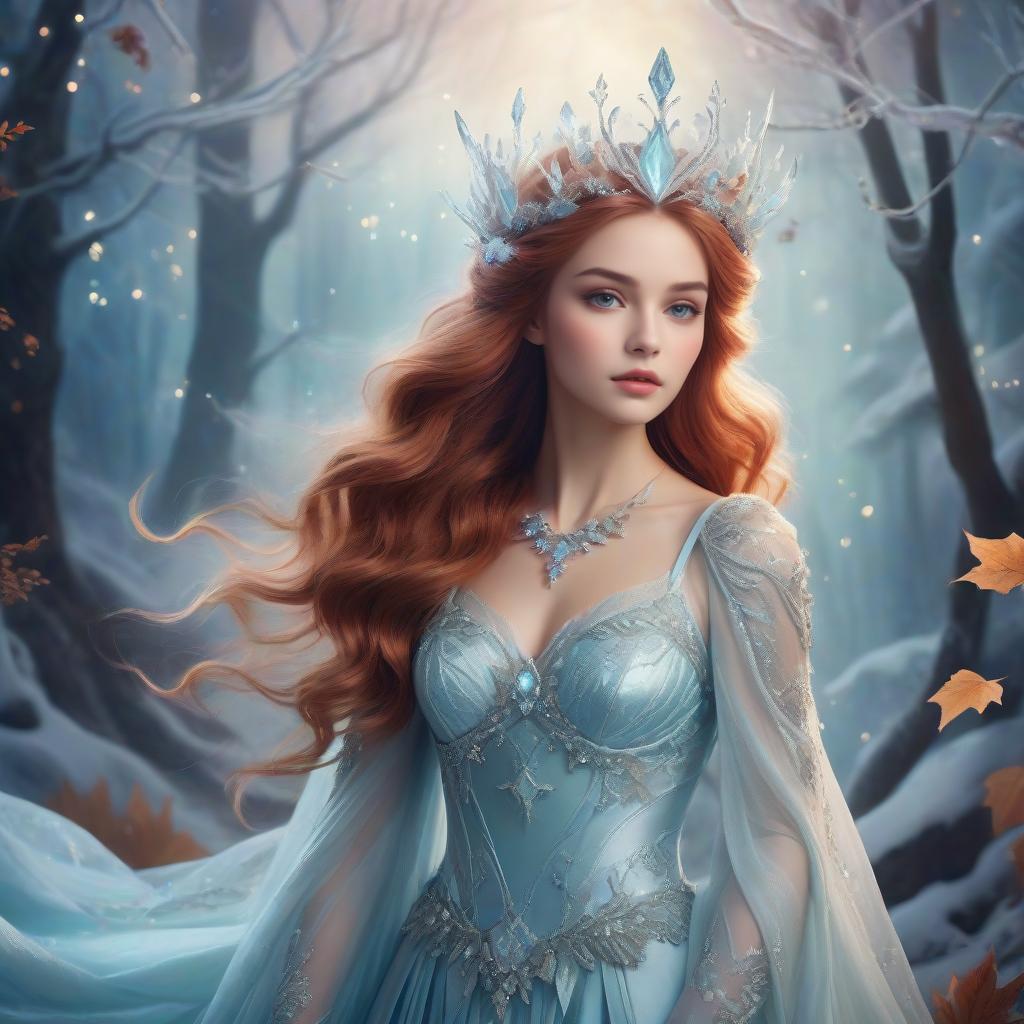 Image in the style of fantastical dreamscape, dainty fairy queen, auburn tousled hair, fit and athletic, sparkling crystal lingerie, enchanted autumn forest studio background BREAK fantasy illustration ethereal high-fantasy style, icy mountain landscape, elegant and regal costume design, soft color palette, painterly brushwork, glowing jewel accents, delicate lighting, mystical and majestic atmosphere, ornate crown and flowing fabrics, dreamlike winter setting
