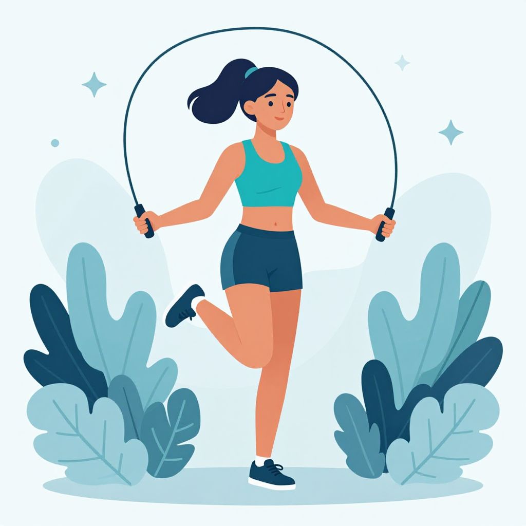 Digital illustration of a fit woman with fair skin and dark blue hair in a ponytail, jumping rope. She wears a turquoise sports bra, navy blue shorts, and black sneakers. Her right leg is bent at the knee, foot raised, and she holds the rope handles in both hands. The background features stylized, light blue and dark blue leaf-like shapes. The image has a clean, modern, and vibrant style with flat colors and simple lines, emphasizing a cheerful and energetic atmosphere. Sparkles are scattered in the background, adding a touch of whimsy.