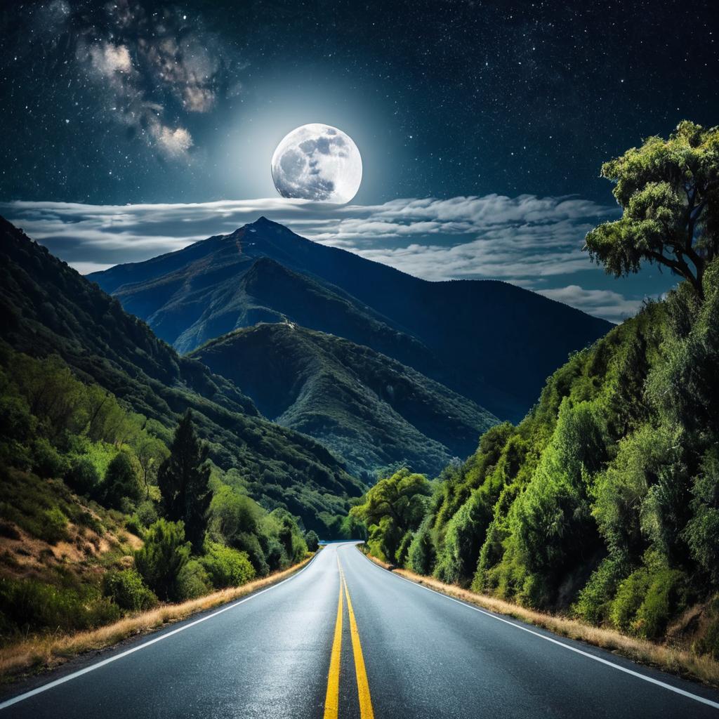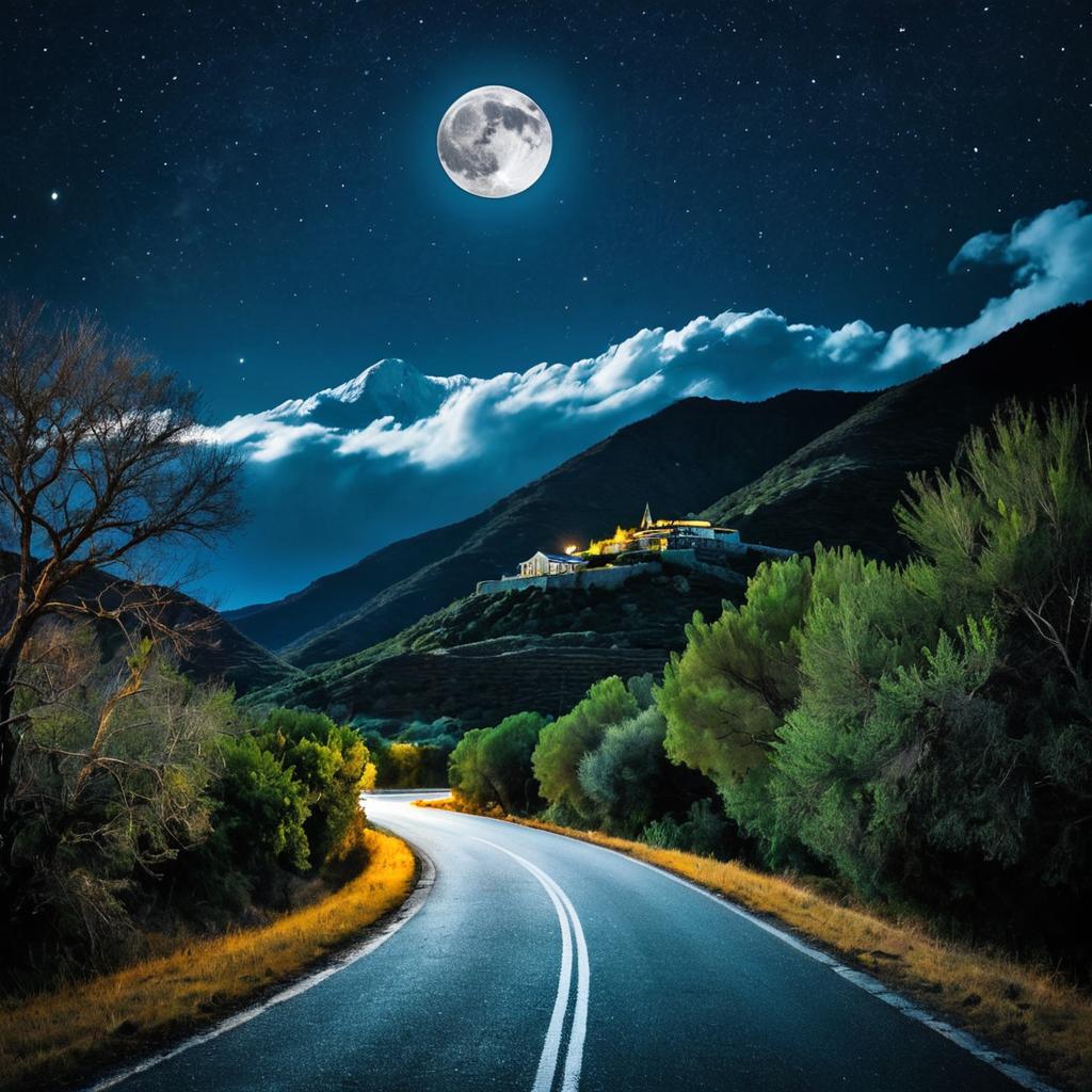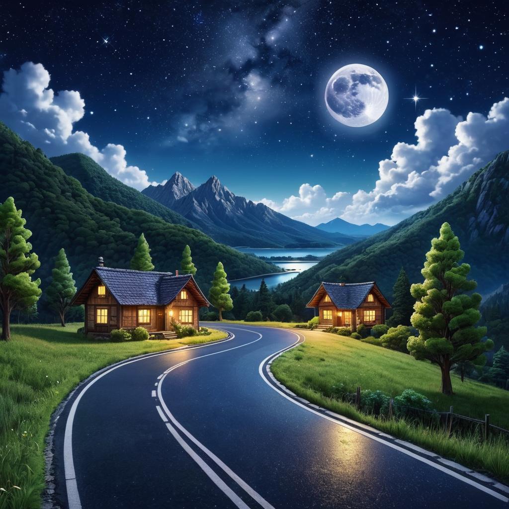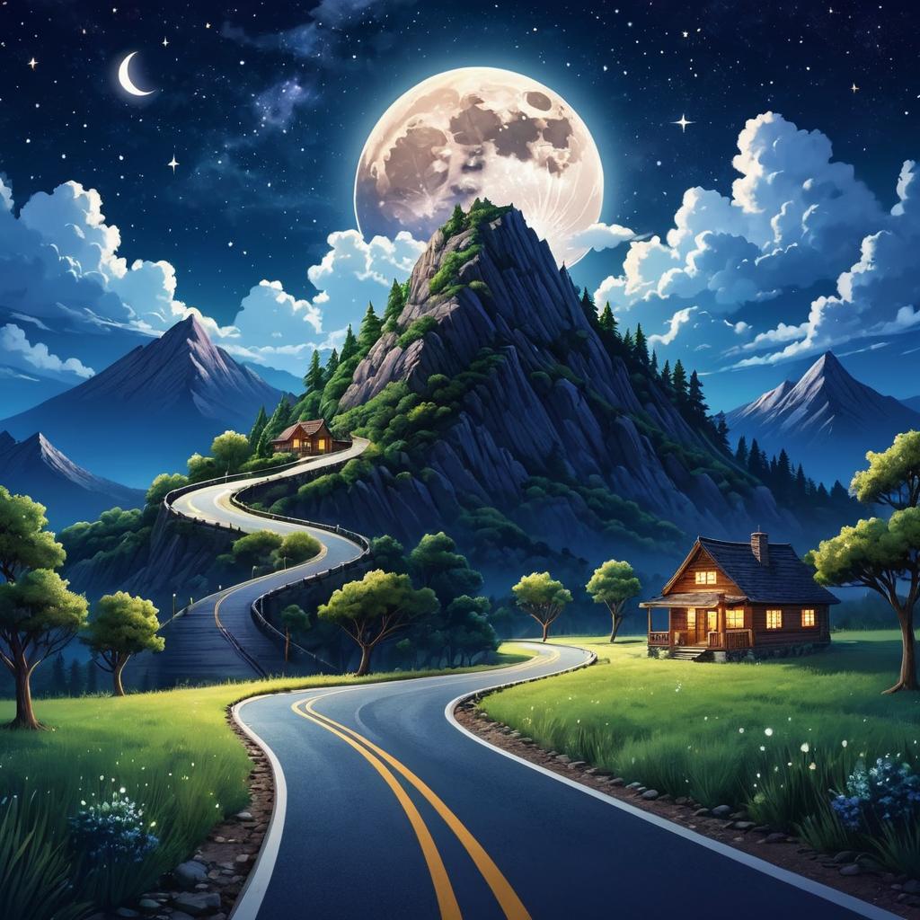 Scenic nighttime landscape featuring a winding road leading through a grassy area with trees and a wooden cabin, surrounded by rocky mountains under a starry sky with a large full moon and crescent moon visible among clouds.