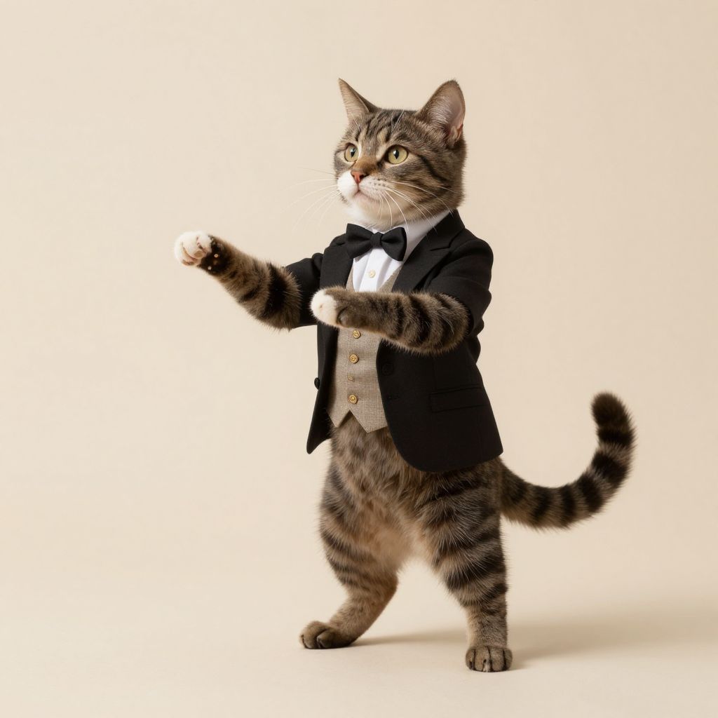 Photograph of a standing tabby cat with brown and black striped fur, wearing a black tuxedo jacket, white dress shirt, and gray waistcoat. The cat has a black bow tie and is positioned with its right paw raised as if performing a gesture. The cat's yellow-green eyes are wide open, and its tail is curled slightly upwards. The background is a plain, bright white, making the cat and its attire the focal point of the image. The cat's expression is focused and slightly serious.