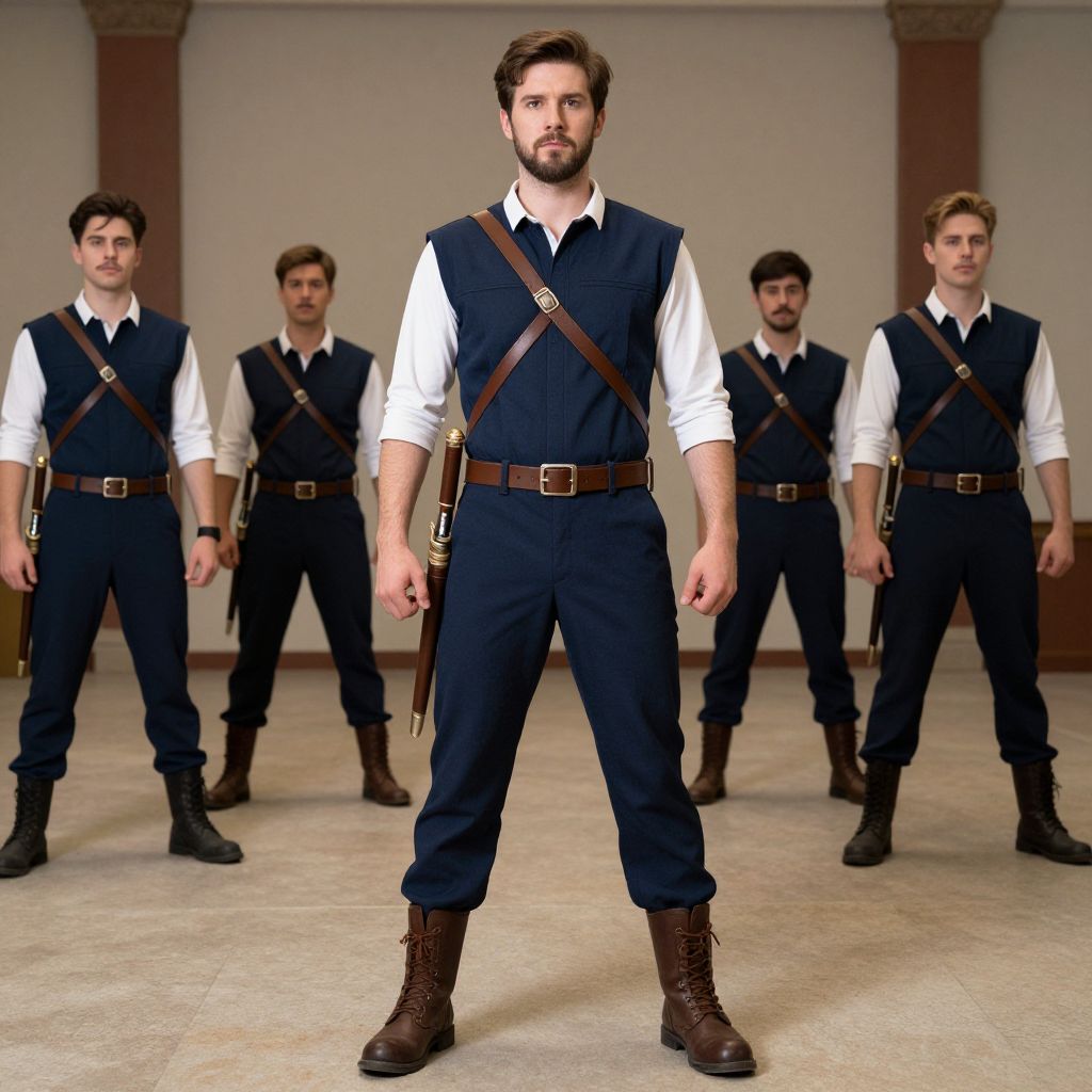Photograph of a group of six men standing in a row indoors. The central man, with a beard and short brown hair, wears a white shirt, navy blue vest, brown leather belt with strap, and brown boots. Five other men, similar in appearance, stand behind him, also in white shirts and navy vests with brown belts and boots. The background is a plain, light-colored wall with two red columns. The men have serious expressions and are evenly spaced, creating a uniform, disciplined look. The lighting is even, highlighting the men's clothing and the room's simplicity.