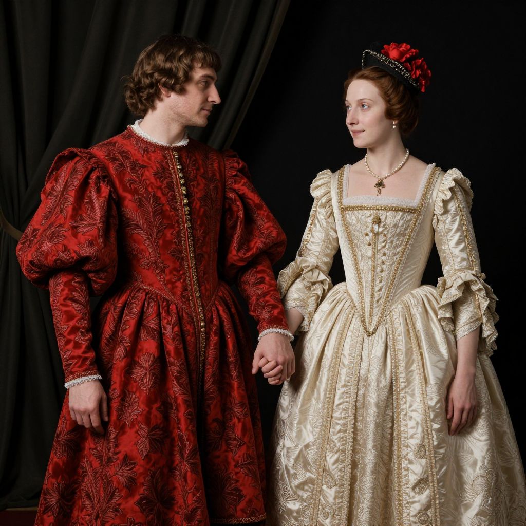 Elegantly dressed figures in Renaissance attire stand side by side, with a man in a richly embroidered red robe holding hands with a woman in a cream gown adorned with intricate ruffles and a decorative headpiece featuring a red flower, set against a dark backdrop with draped curtains.