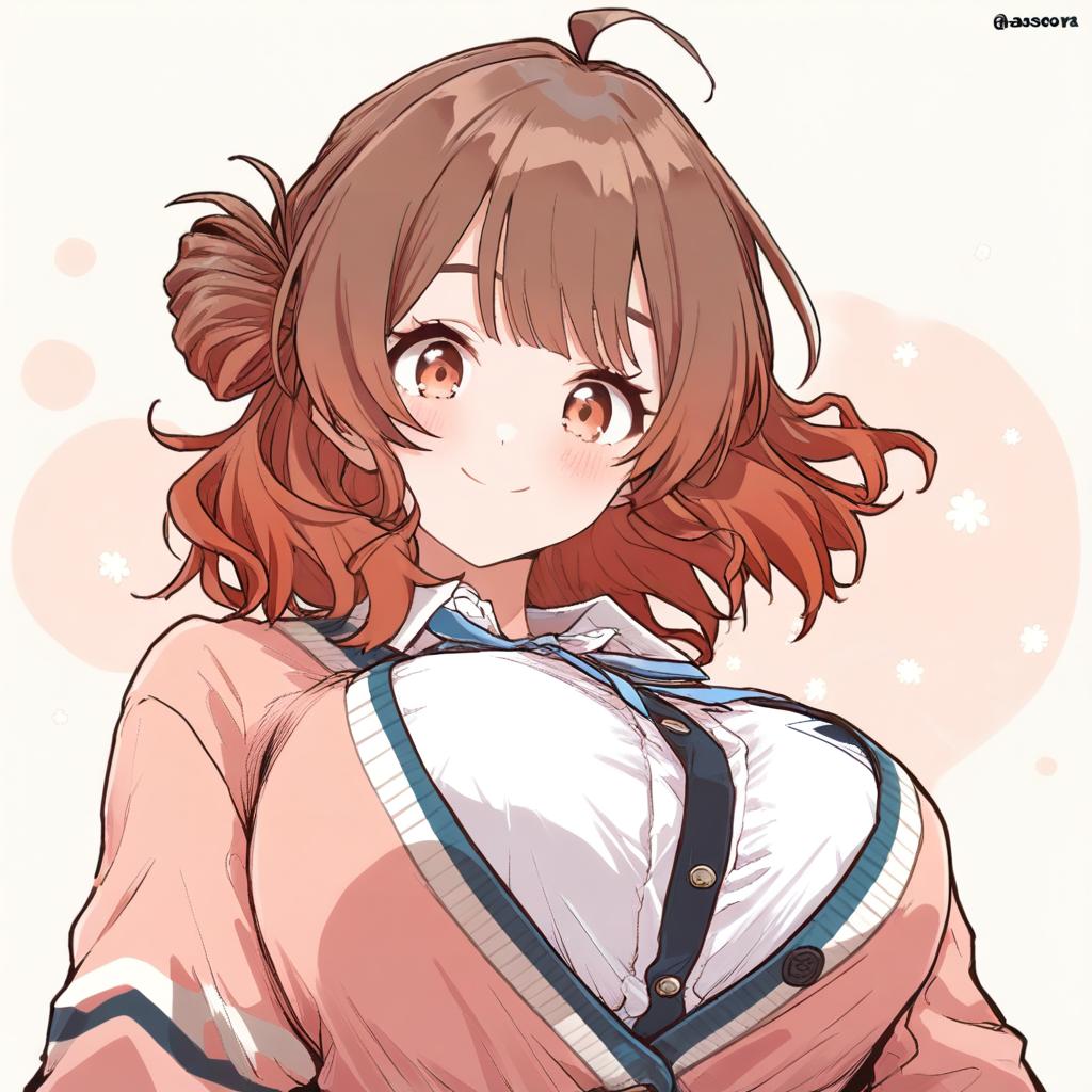 Digital anime-style illustration of a young female character with medium-length brown gradient hair styled with an ahoge and a single side bun. She has large brown eyes and a gentle smile. The character is dressed in a school uniform featuring a white shirt, a pink cardigan with striped detailing, and a blue ribbon tie. The background is soft with light pastel tones and subtle flower patterns.