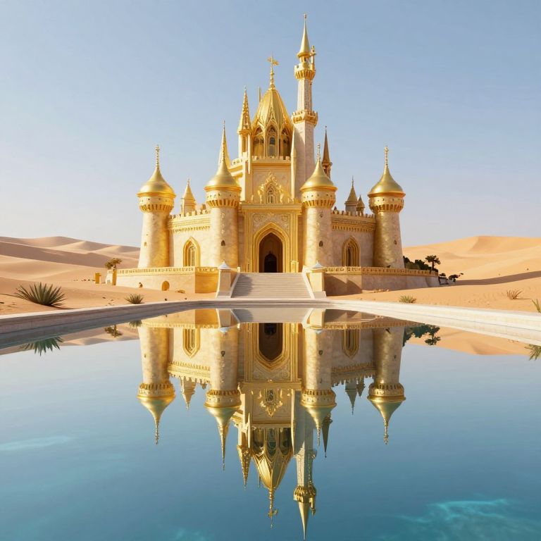 Photorealistic digital image of a golden, ornate castle with four towers, reflecting in a calm, mirror-like desert oasis.