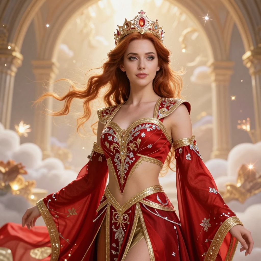 A regal woman with long flowing red hair and an elegant red outfit adorned with golden embroidery stands confidently in a majestic palace garden. She wears a ornate crown on her head, featuring intricate gemstones and a delicate filigree design, symbolizing royal power and grace. The scene is illuminated by soft golden sunlight filtering through blooming cherry blossoms, casting a warm, dreamy atmosphere. The overall mood is majestic, serene, and slightly mystical, blending fantasy and elegance.