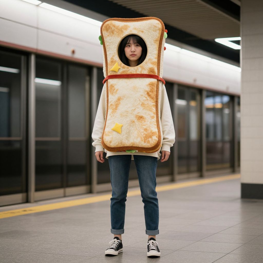 Subway Sandwich Costume, woman in a hoodie and jeans standing in a subway station