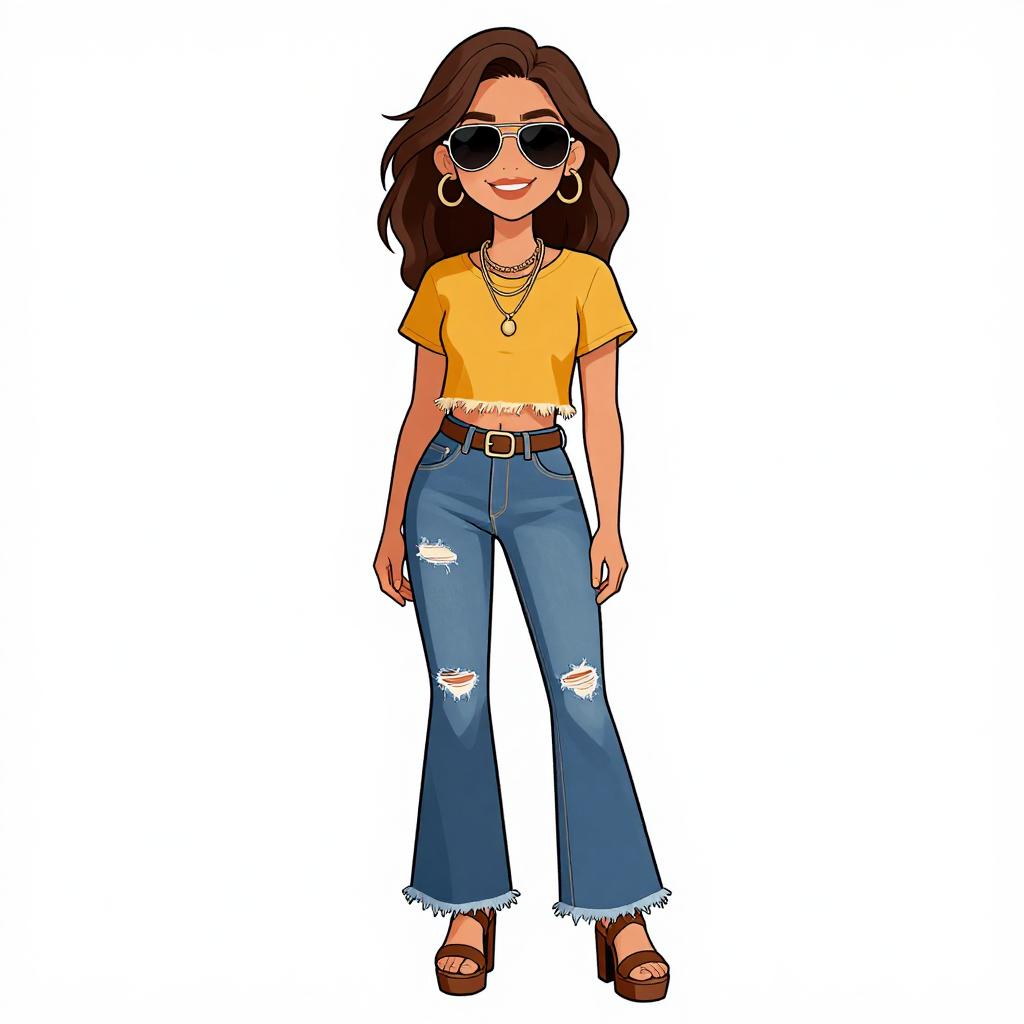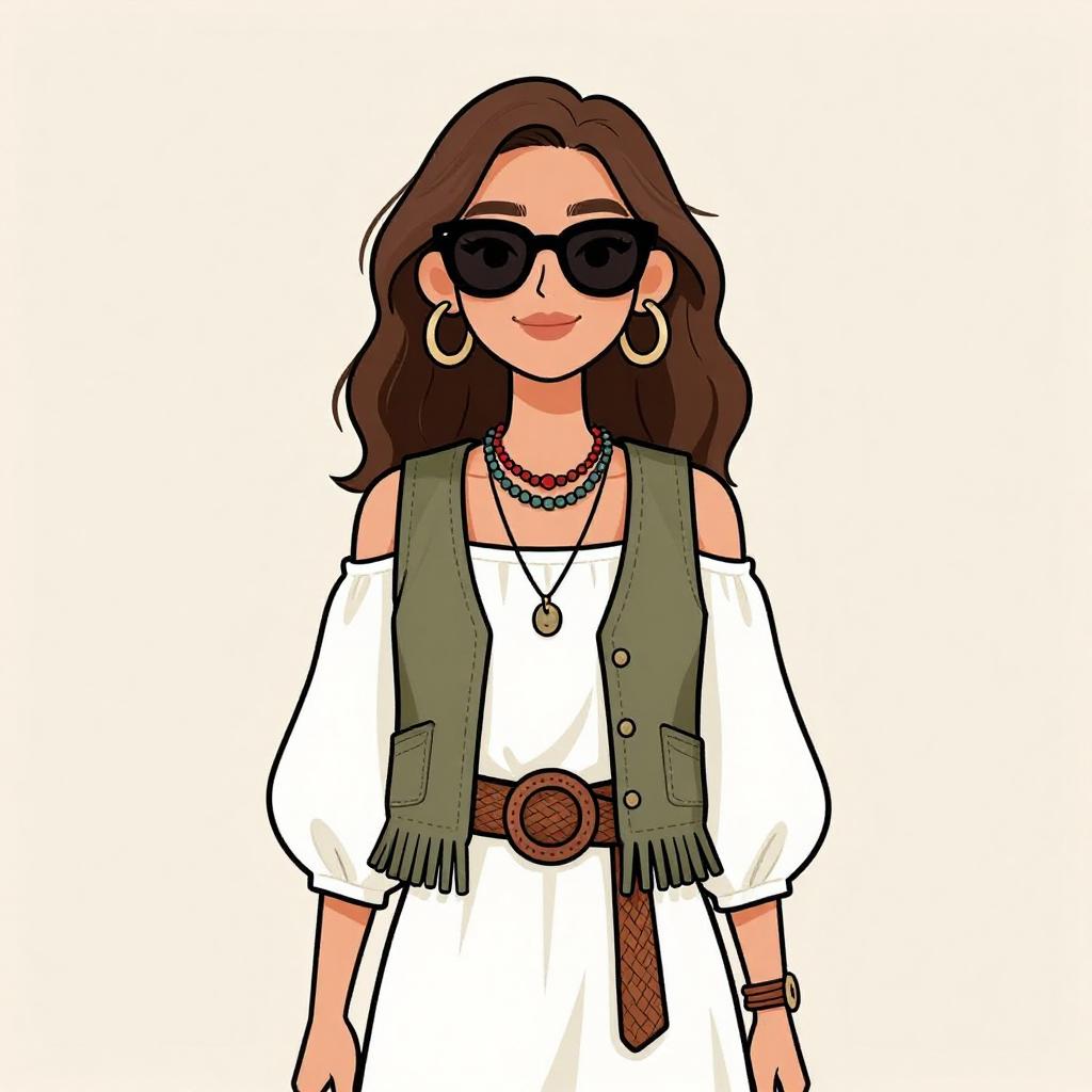 Illustration of a stylish woman with long brown hair wearing oversized black sunglasses, gold hoop earrings, and layered beaded necklaces. She is dressed in a white off-the-shoulder dress with three-quarter balloon sleeves, an olive green fringe vest with no closure, and a brown woven belt featuring a large circular buckle. She also wears a brown watch on her wrist.