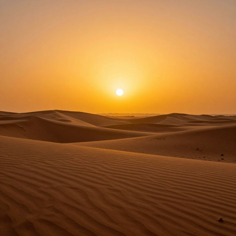 Photograph of a golden sunset over rippled sand dunes, with the sun low on the horizon, casting warm orange and yellow hues.