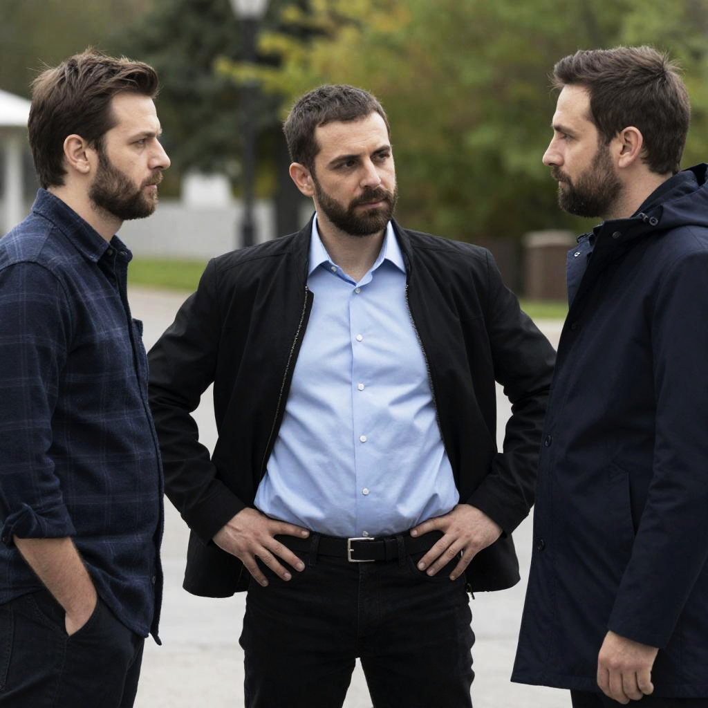 Photograph of three men standing outdoors. Central man with light blue shirt, black jacket, and dark pants, hands on waist, looking at the man on the right. Left man in dark plaid shirt, right man in dark hooded coat, both looking at the central man. Background: blurred greenery and pathway. All men have short hair, beards, and serious expressions.