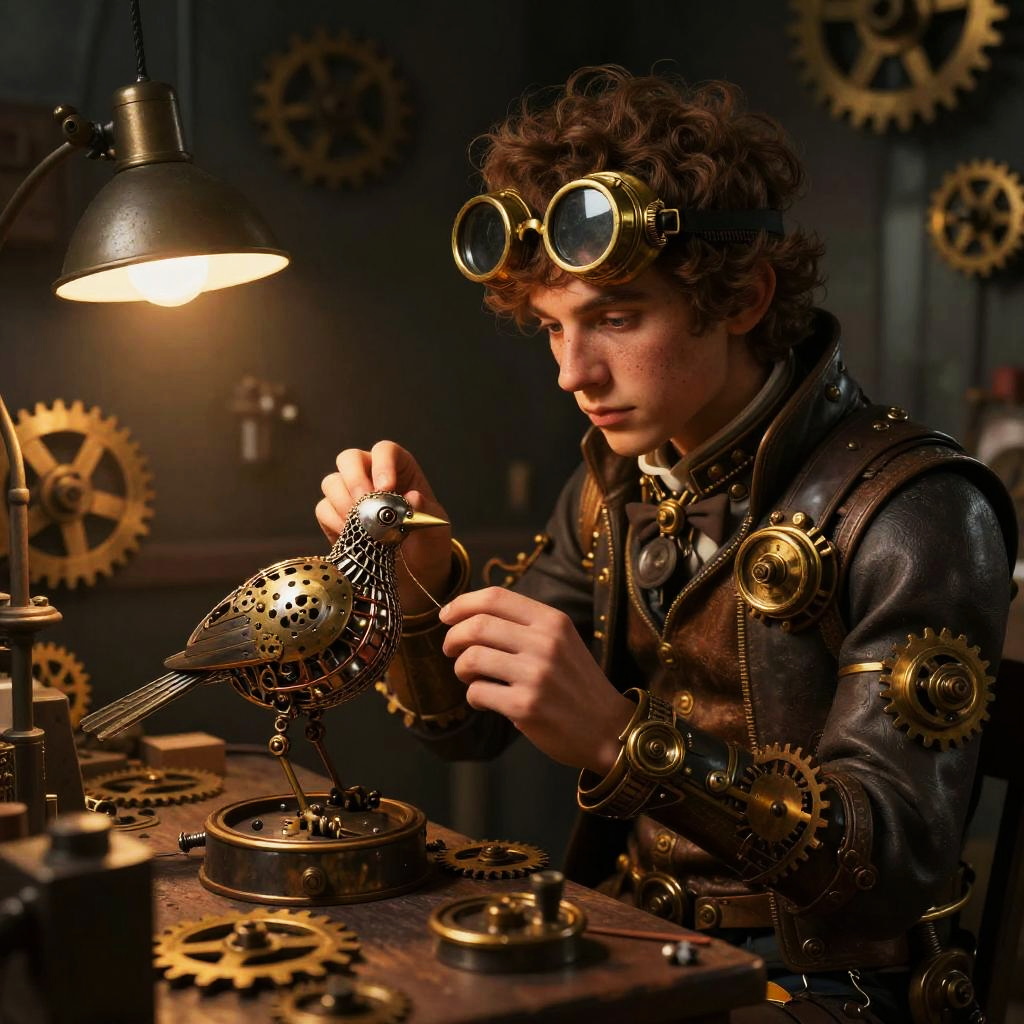Rian, steampunk inventor in a cluttered workshop full of gears and inventions, brass goggles perched on forehead, tinkering with a mechanical bird, warm amber lighting casting deep shadows, detailed textures and vintage color palette, imaginative and whimsical atmosphere.