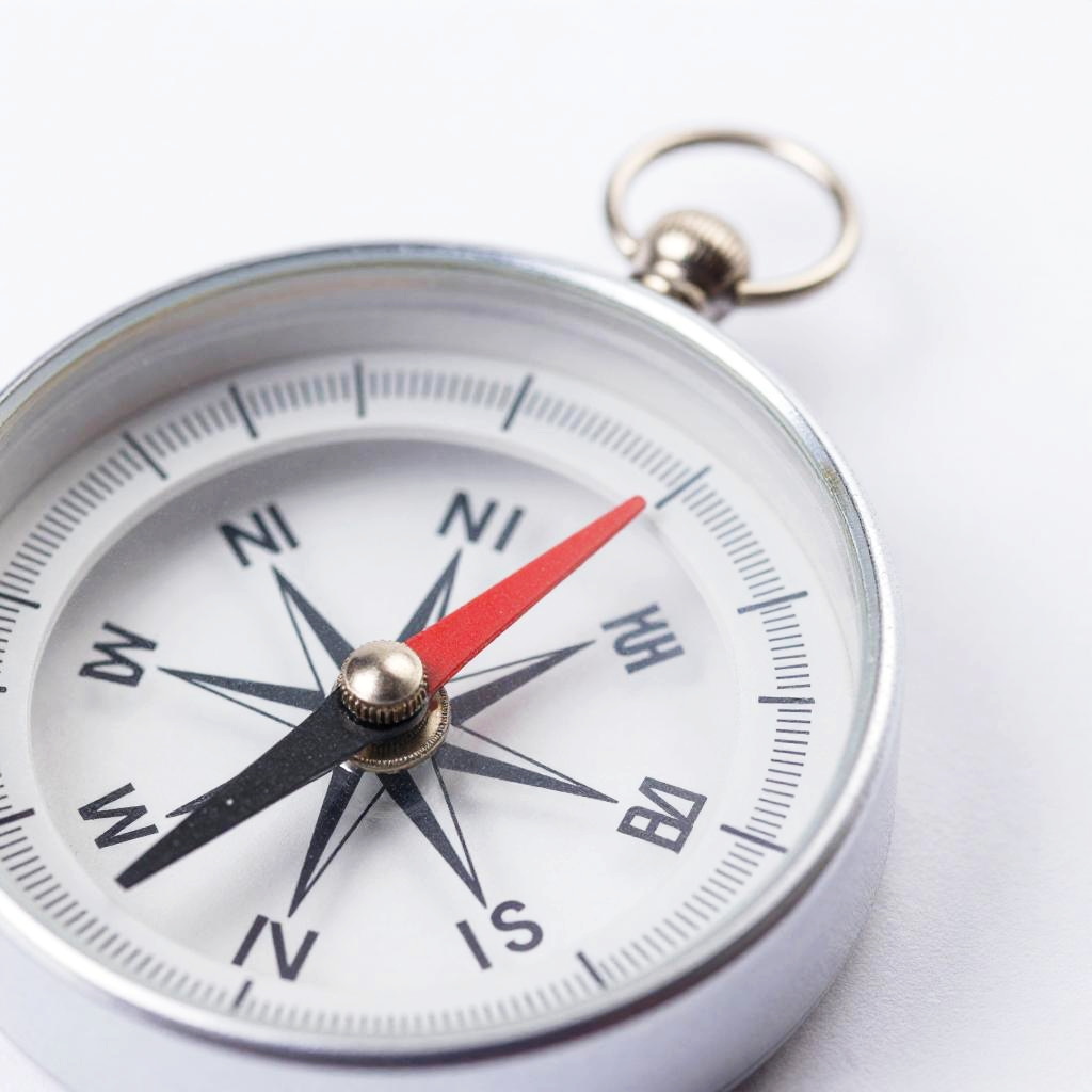 Close-up photo of a shiny silver compass with a clear glass face and black needle. The red needle is pointing northeast. The compass has black markings for directions and numbers around the edge. The background is a bright white, making the compass and its details stand out sharply. The image has a slightly blurred effect, adding a dynamic feel.