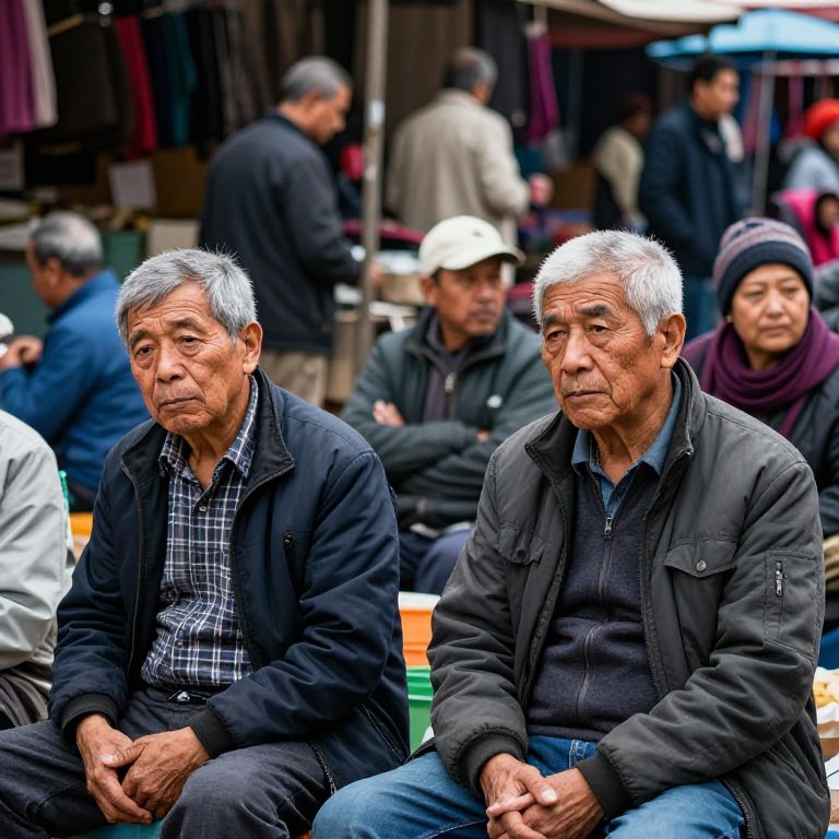 Photograph of two elderly Asian men with gray hair, wearing black jackets and plaid shirts, sitting outdoors among a blurred background of people in a busy