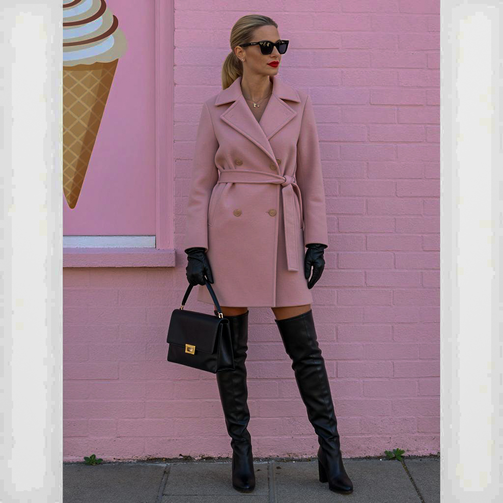 Woman standing against pink brick wall. Pink wrap coat, black leather gloves, thigh-high black leather boots, black handbag with gold buckle. Blonde hair in ponytail, sunglasses, red lipstick. Hands relaxed by sides. Background includes ice cream illustration. Casual pose.