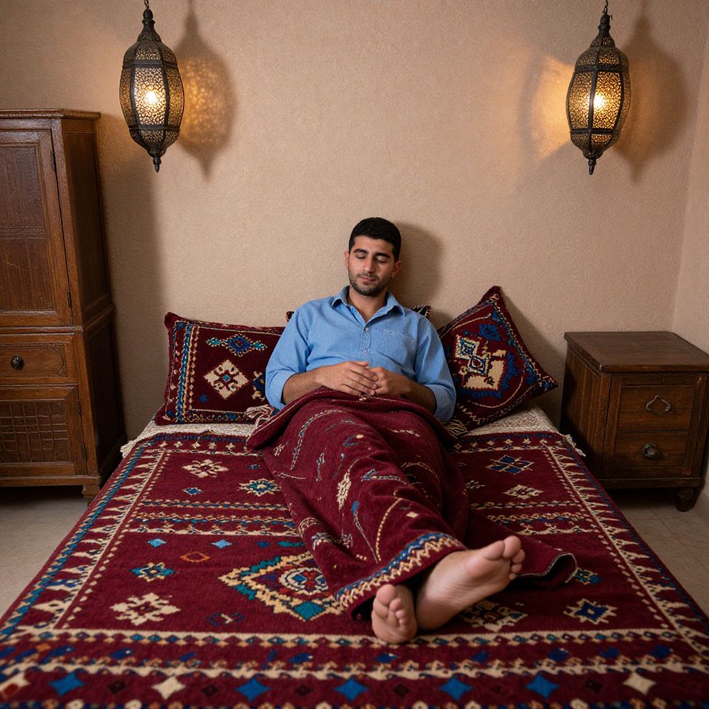 Moroccan man in bed, vibrant patterned blankets and cushions surrounding him, traditional Moroccan room with decorative lanterns casting soft shadows, rustic wooden furniture, relaxed and peaceful expression, earthy color palette with deep reds and blues.