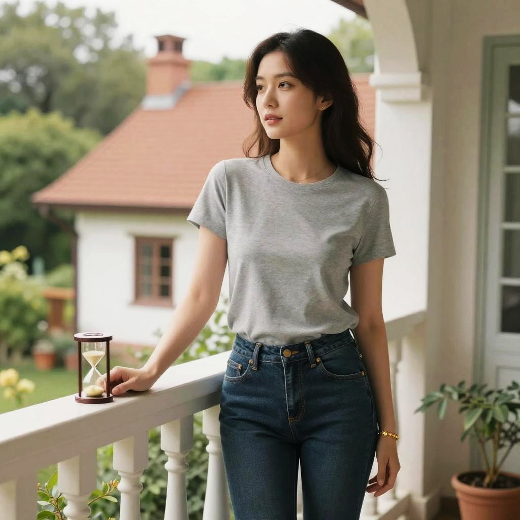 A Hourglass woman in a casual chic heather grey short-sleeve t-shirt and dark wash skinny jeans stands on a balcony in a charming cottage, surrounded by lush greenery, in a Studio Ghibli visual style. A gold bracelet glimmers on her wrist as she enjoys the serene view. Sexy. Pretty face and beutiful eyes
