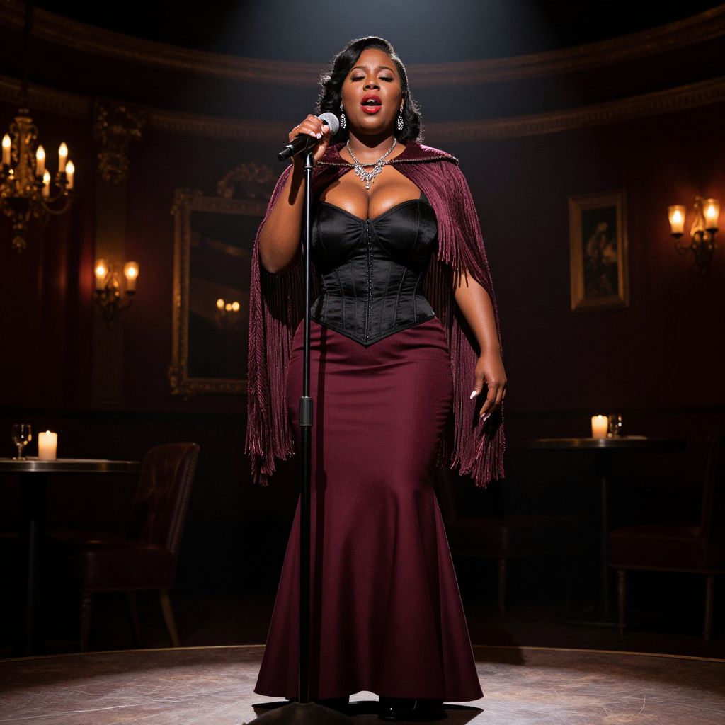 A high-resolution photograph of a confident Black woman in a richly detailed 1930s blues singer costume—deep burgundy flared skirt, black corset top, and fringe-trimmed cape—standing center stage in a vintage jazz bar with candlelit ambiance, her face lit by a single spotlight, eyes closed as she begins to sing, the deep tones of the room and her outfit creating a powerful, soulful mood.. The woman has big tits and cute face
