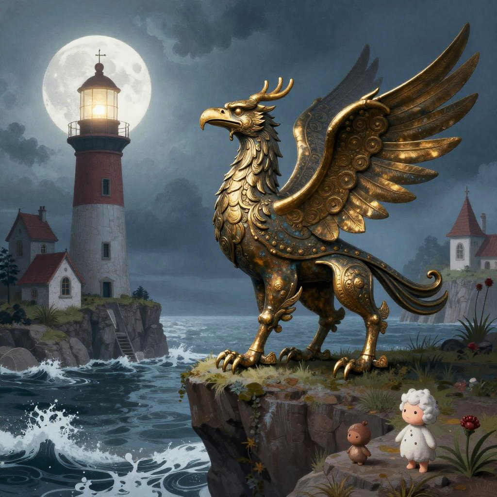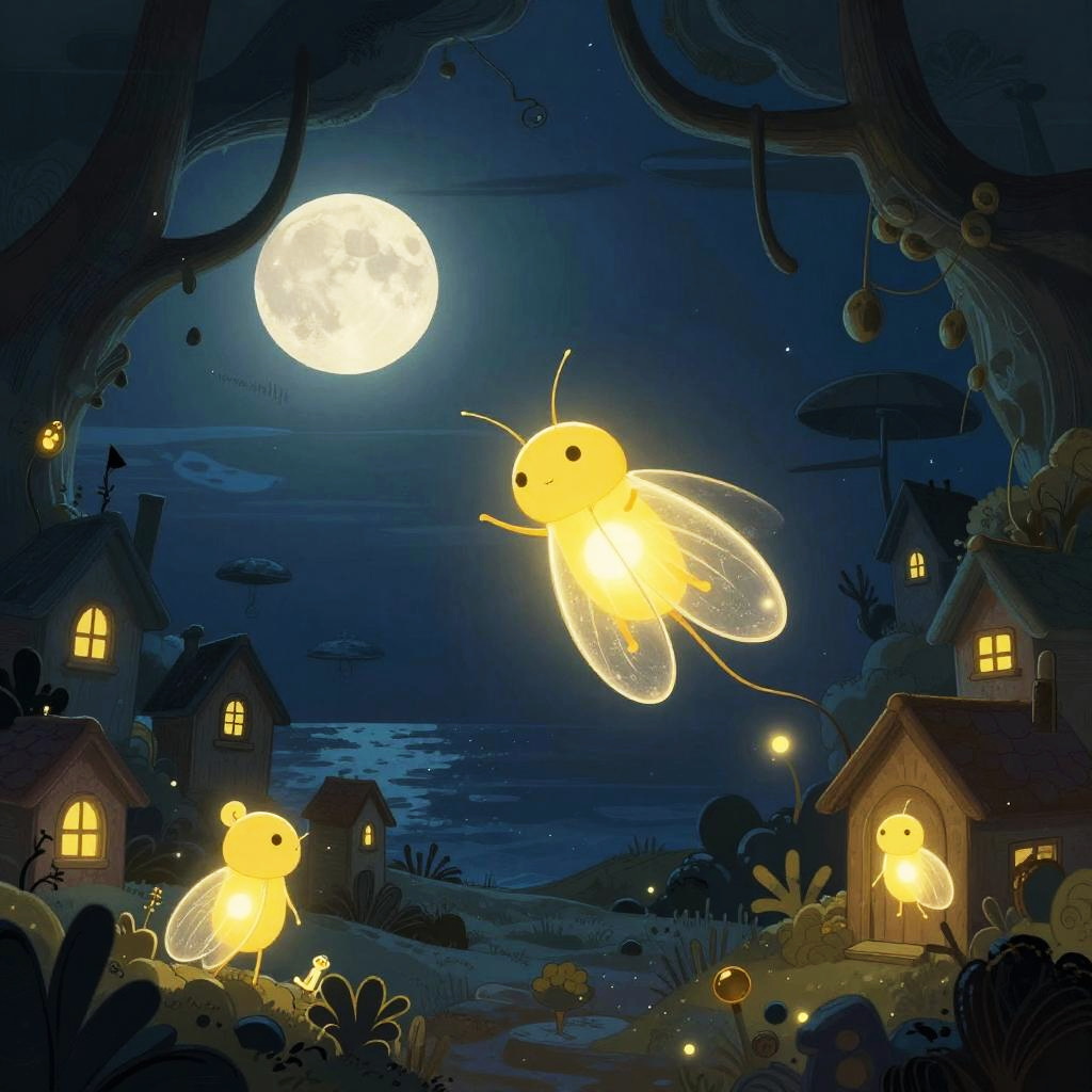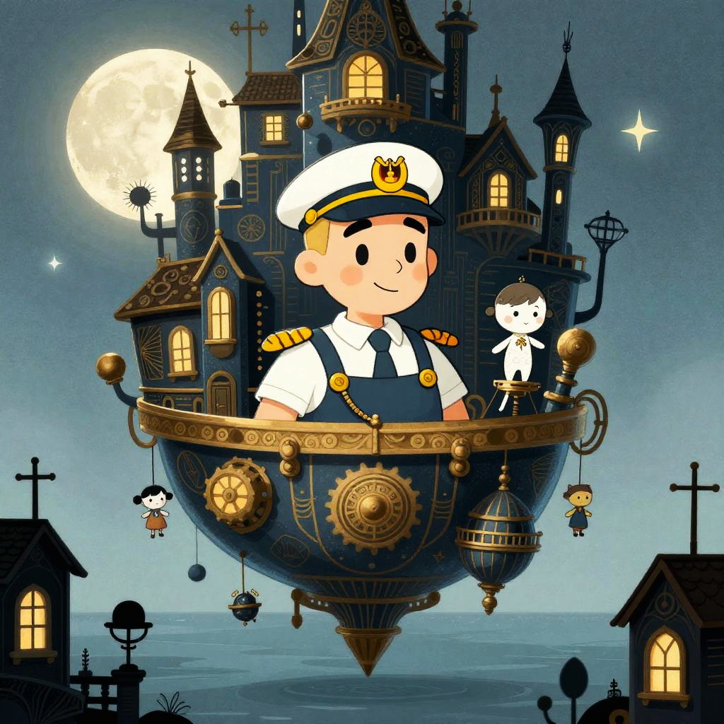 Hard cartoon illustration of hummingbird by sunken garden, in the style of surreal expressionist, with dark gold and light blue palette, dreamy quality, haunting houses, whimsical childlike figures, romantic moonlit seascape.