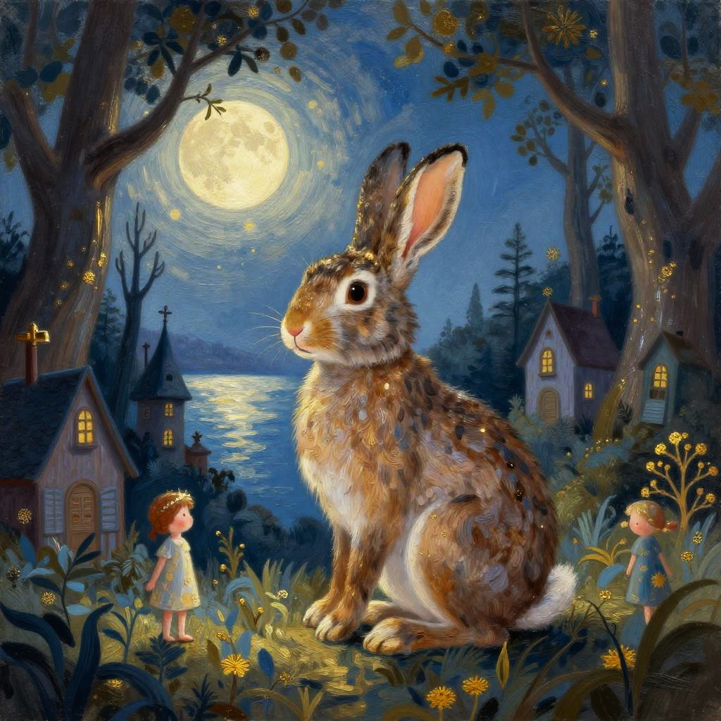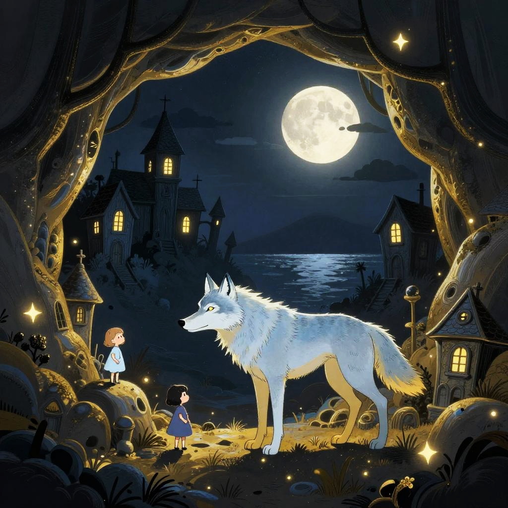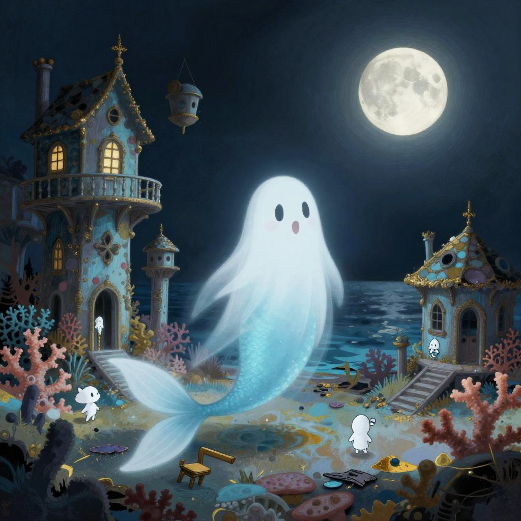 Hard cartoon illustration of hummingbird by sunken garden, in the style of surreal expressionist, with dark gold and light blue palette, dreamy quality, haunting houses, whimsical childlike figures, romantic moonlit seascape.