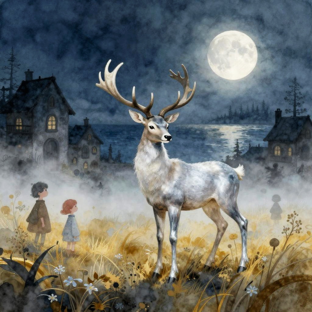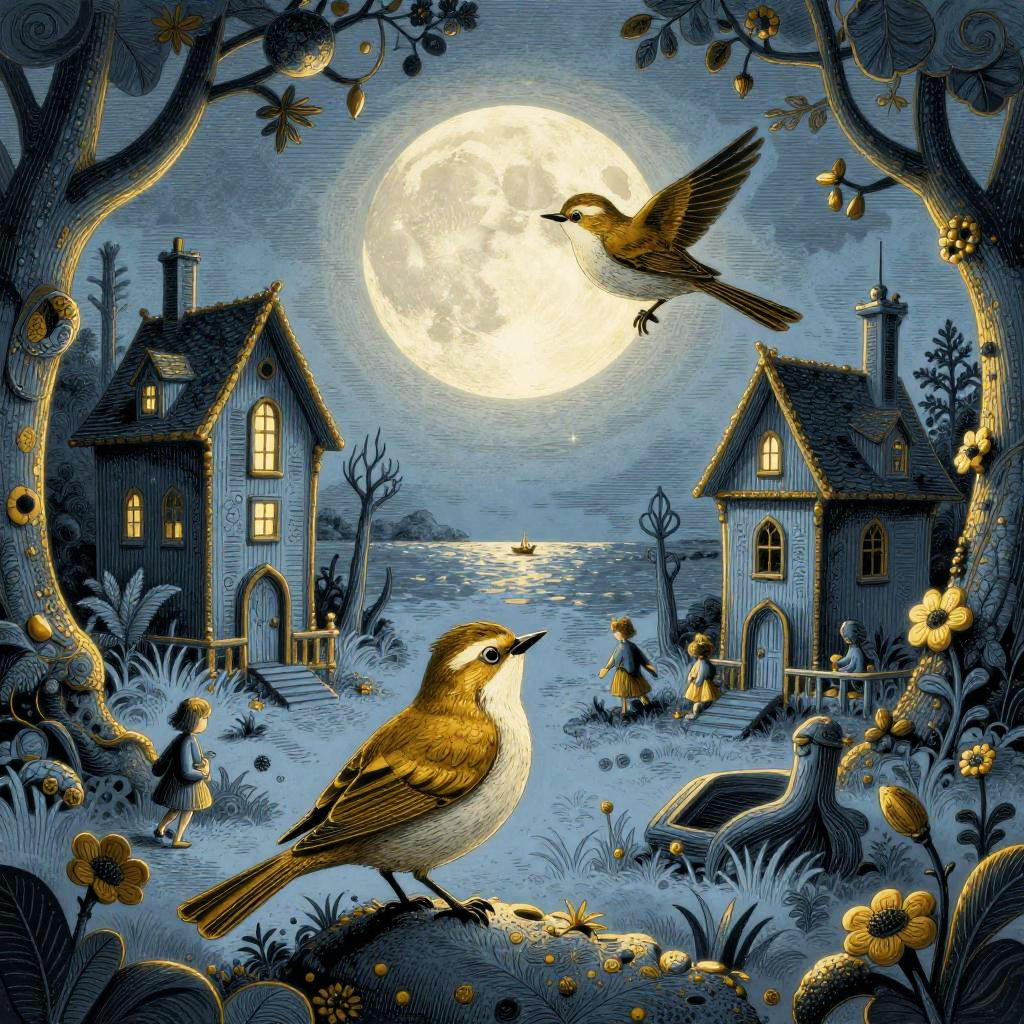 A hard cartoon style surreal illustration featuring a hummingbird perched among yellow flowers in the foreground, set by a moonlit seascape with two haunting houses on either side of the water. The artwork uses a dark gold and light blue color palette, enhancing its dreamy and whimsical quality with a romantic atmosphere and childlike expressionist elements.