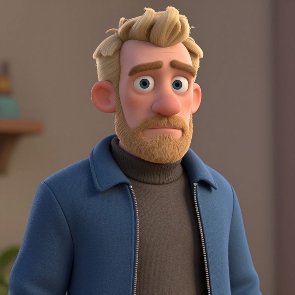 A gangly british man, with short blond hair and short blond beard wearing a blue jacket and brown turtleneck , blue eyes, pale skin, english heritage, digital art, cartoon, mid-shot, 8k