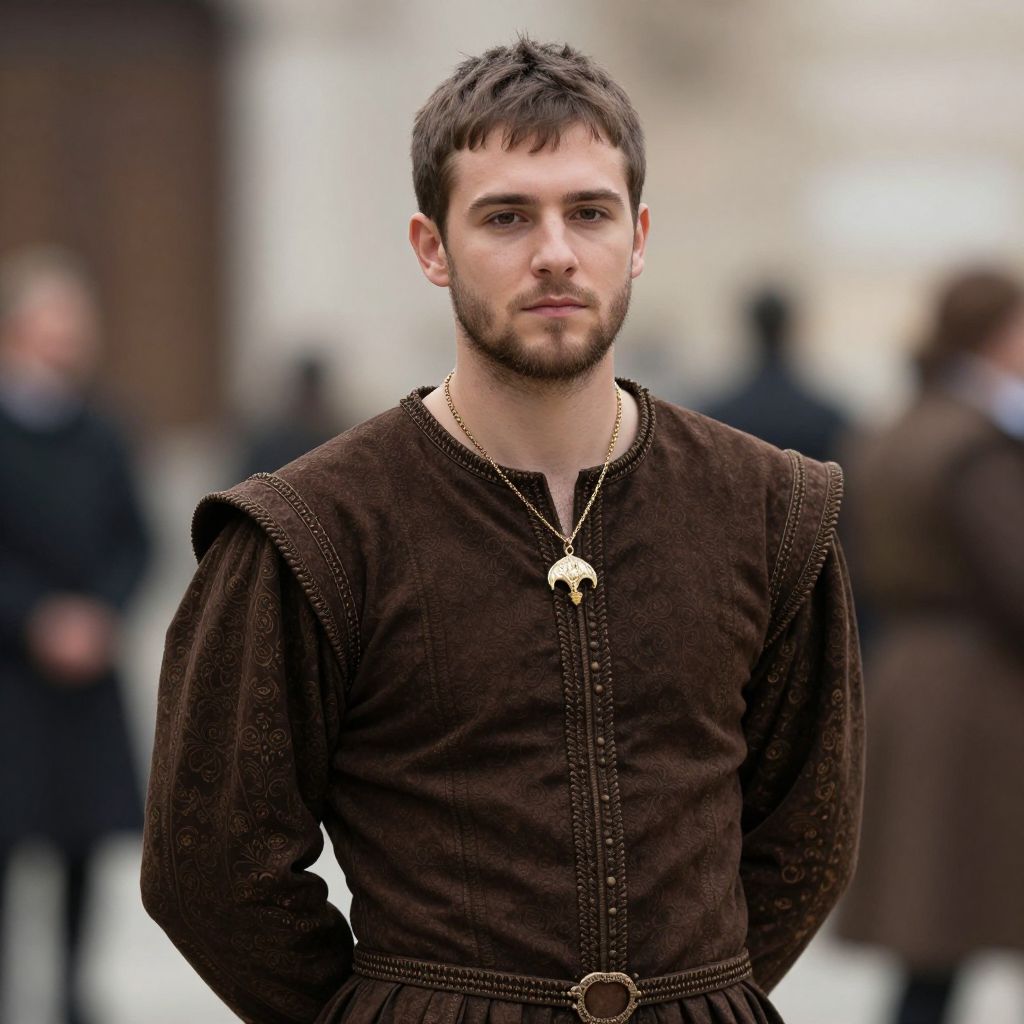 Photograph of a young, white man with short, dark brown hair and a trimmed beard. He has a serious expression and is wearing a brown, medieval-style tunic with puffed sleeves and a gold necklace featuring a circular pendant. The background is blurred, showing indistinct figures in dark clothing and a light-colored building, suggesting an outdoor urban setting. The image has a shallow depth of field, focusing sharply on the man while the background remains out of focus. The overall color palette is muted, with earthy tones dominating the scene.