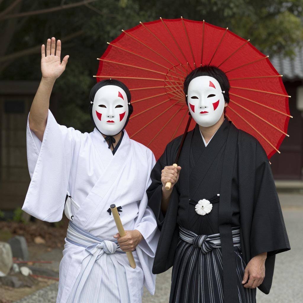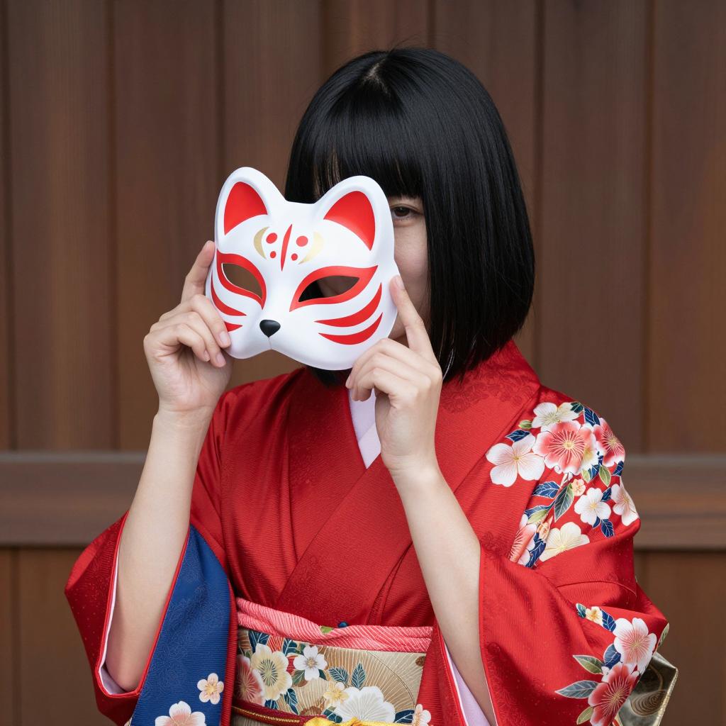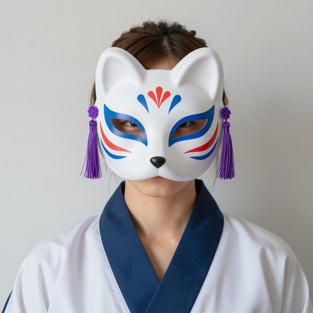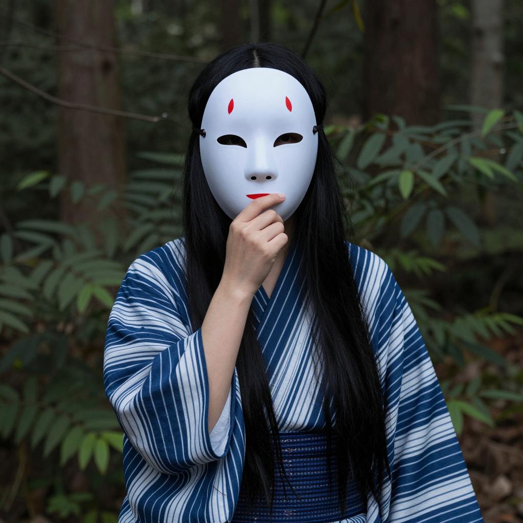 Person in forest wearing blue and white striped kimono, white mask with red markings, long black hair, hand near mouth. Dark green foliage and tree trunks in background. Standing among underbrush. Mask has calm expression. Photo.