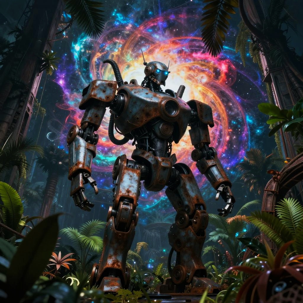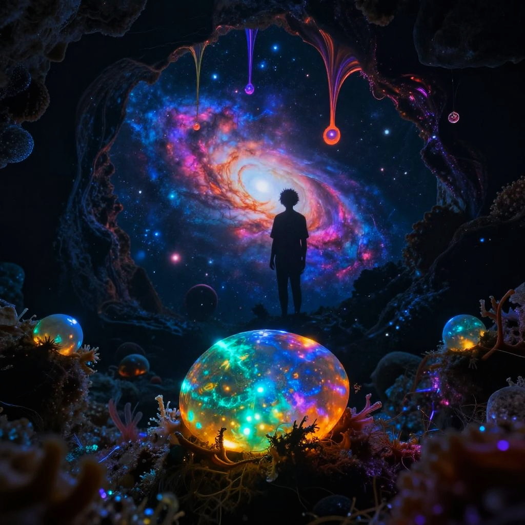 Glowing crystal cavern, multicolored gems with embedded light, silhouetted in a vivid multicolored galaxy, psychadelic cosmic swirls, cinematic, 6k resolution, dark and psychedelic atmosphere,