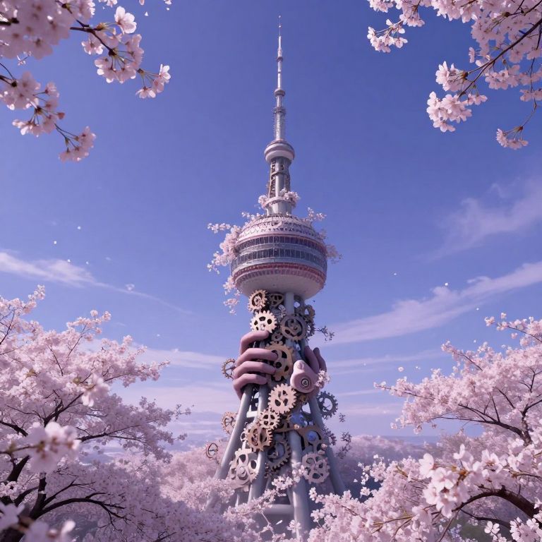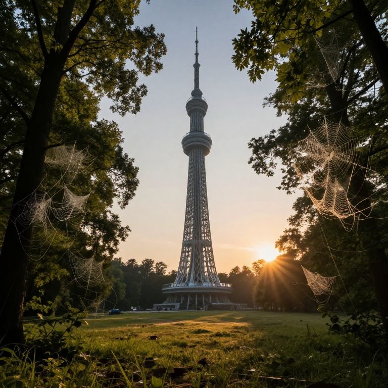 Photograph of Berlin TV Tower at sunset, framed by trees with spider webs, sunlight filtering through, creating a serene, natural contrast.