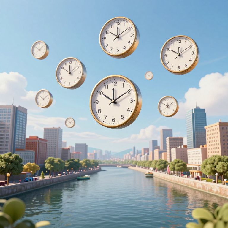 A digital illustration depicts a vibrant cityscape with a river running through it, flanked by tall buildings and green trees. Floating in the bright blue sky are seven large, round clock faces displaying different times. The clock faces are golden-framed and white with black numbers and hands. The river reflects the clear sky and cityscape. The buildings vary in height and style, with some modern skyscrapers and others older brick structures. The overall scene is bright and cheerful, with a sense of timelessness conveyed by the floating clocks.